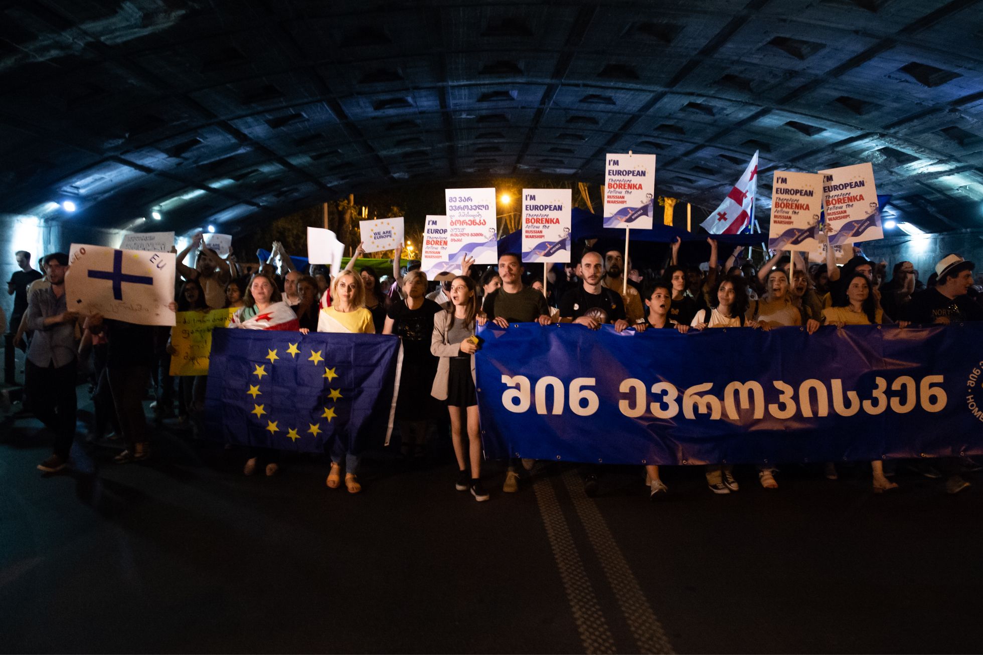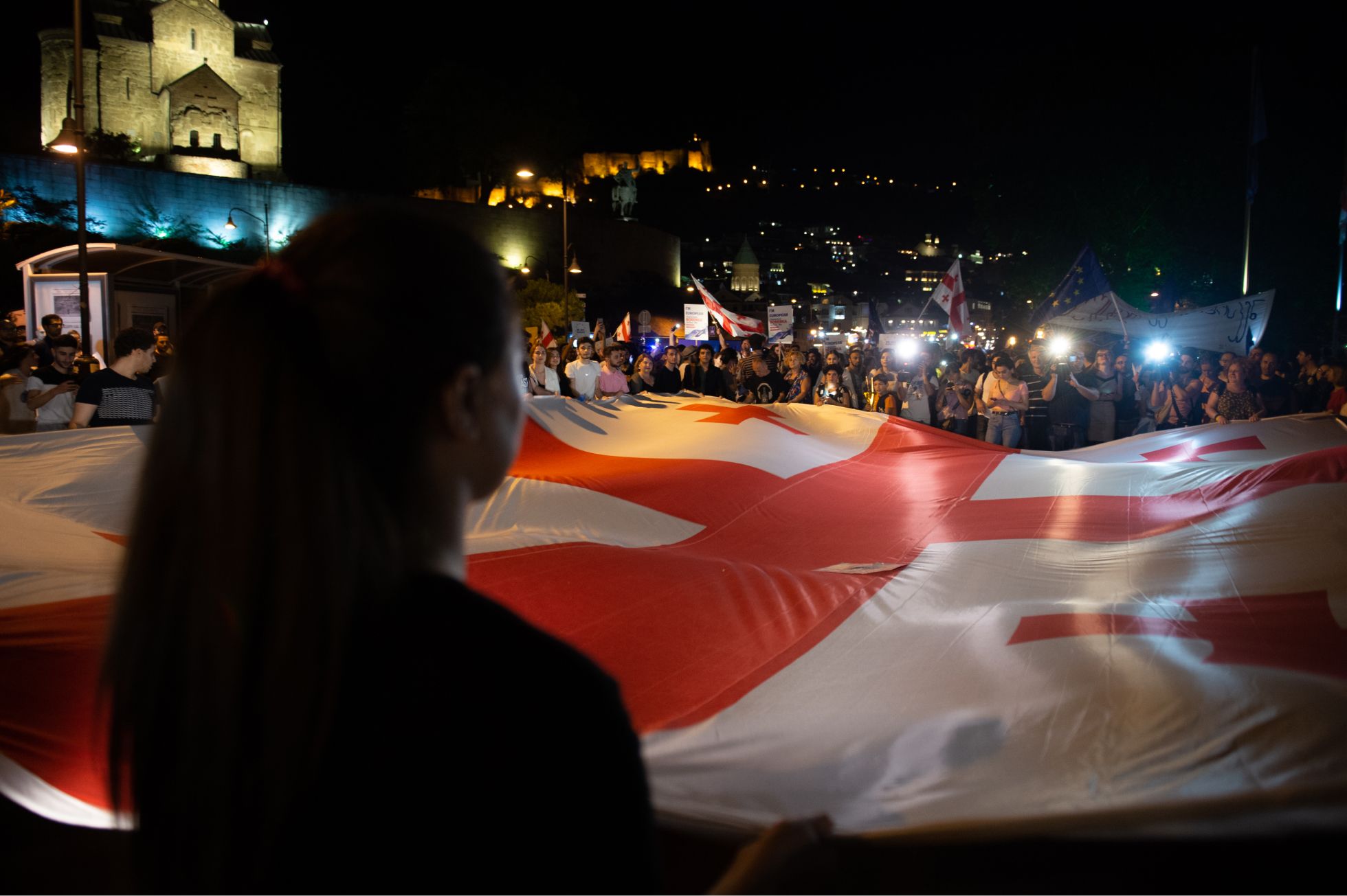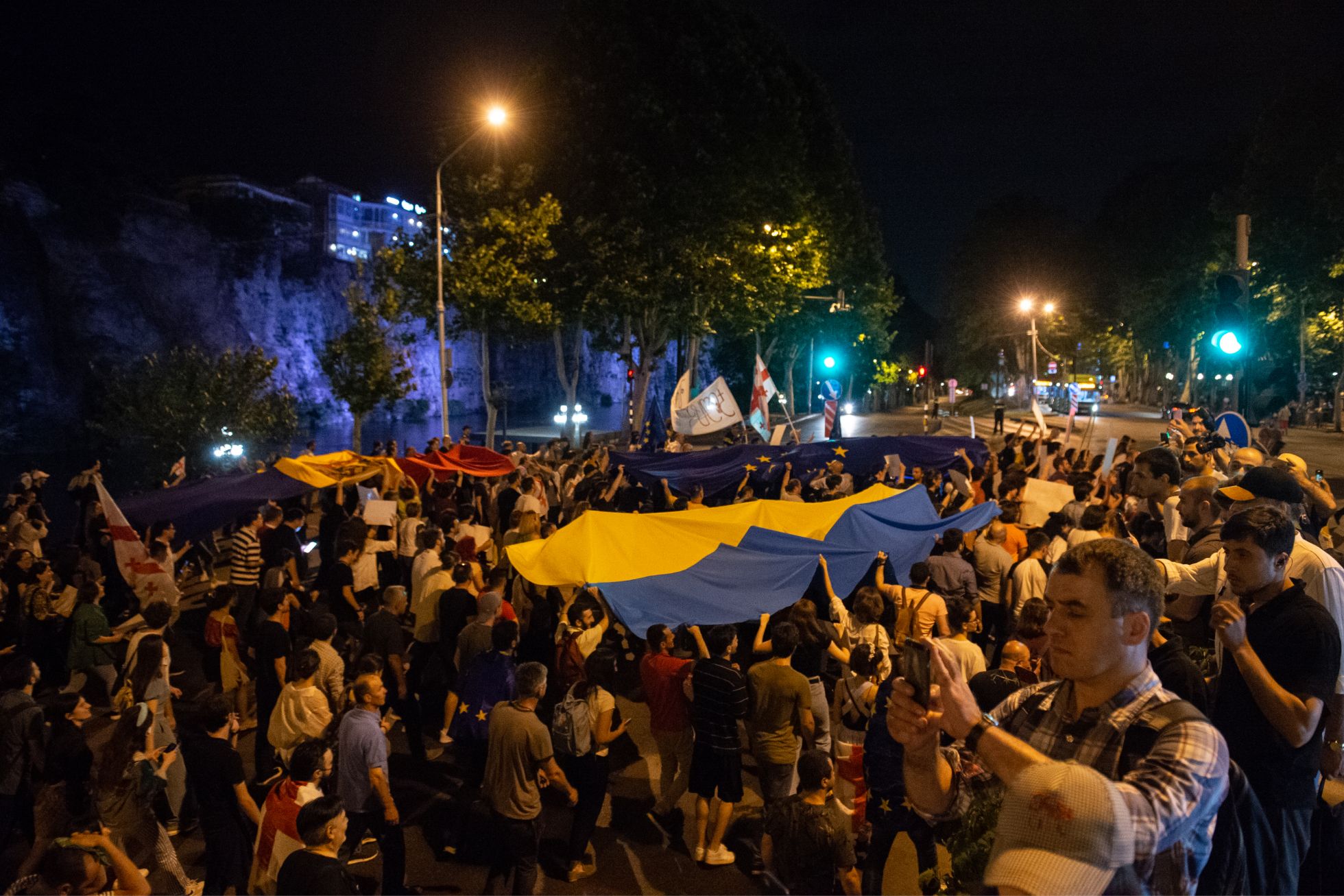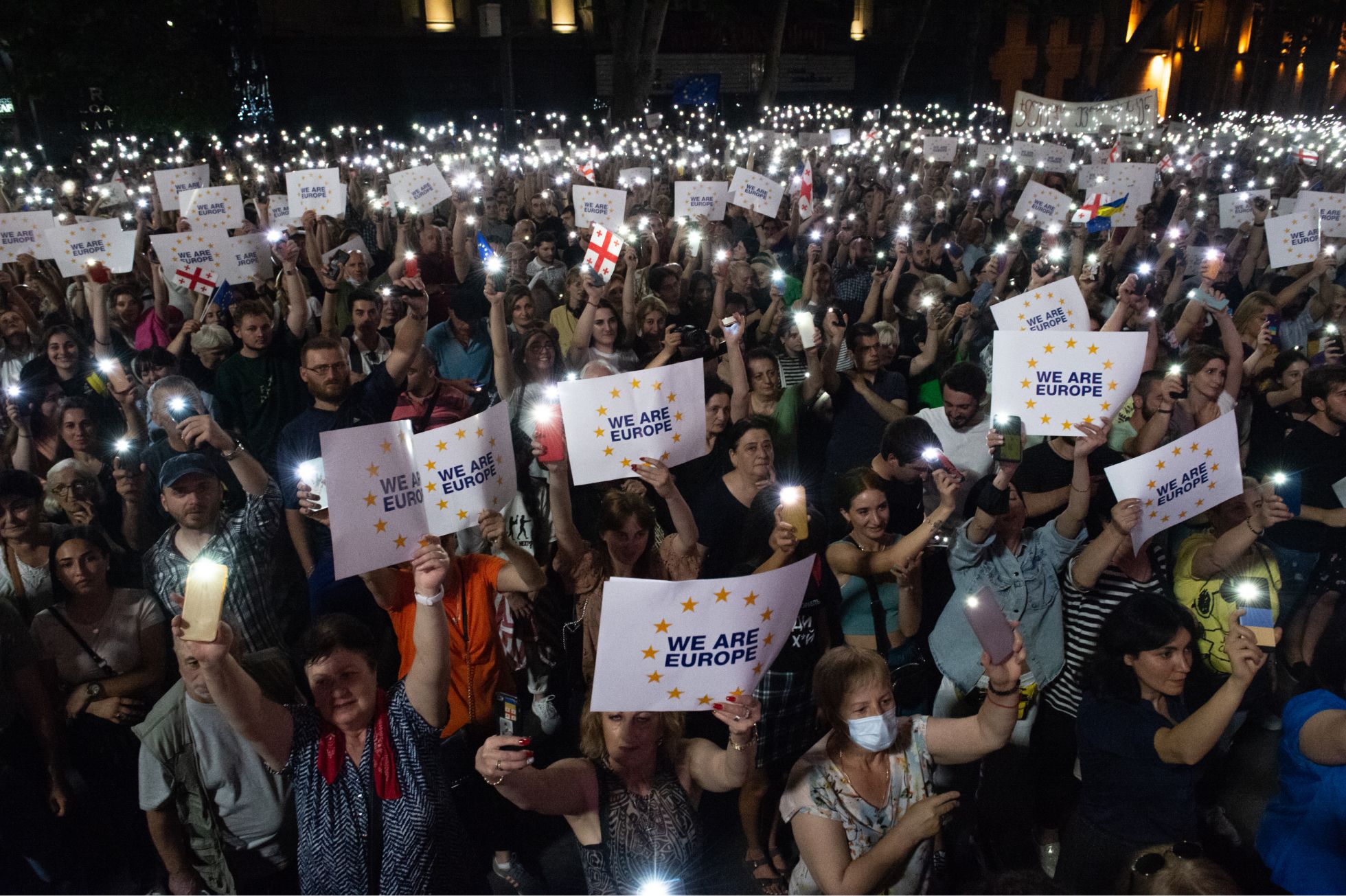 Вечером 20 июня у здания парламента в центре Тбилиси собрались от 30 до 50 тысяч человек. В руках они держали флаги Грузии и Евросоюза. Несколько активистов в толпе раздавали плакаты размера A4 с надписью «We are Europe». На подступах к зданию выстроилось несколько десятков человек с транспарантами в поддержку бывшего президента Михаила Саакашвили, который находится в СИЗО. Еще до начала акции они скандировали в мегафоны одно слово — «Миша», пытаясь перекричать играющий гимн ЕС.