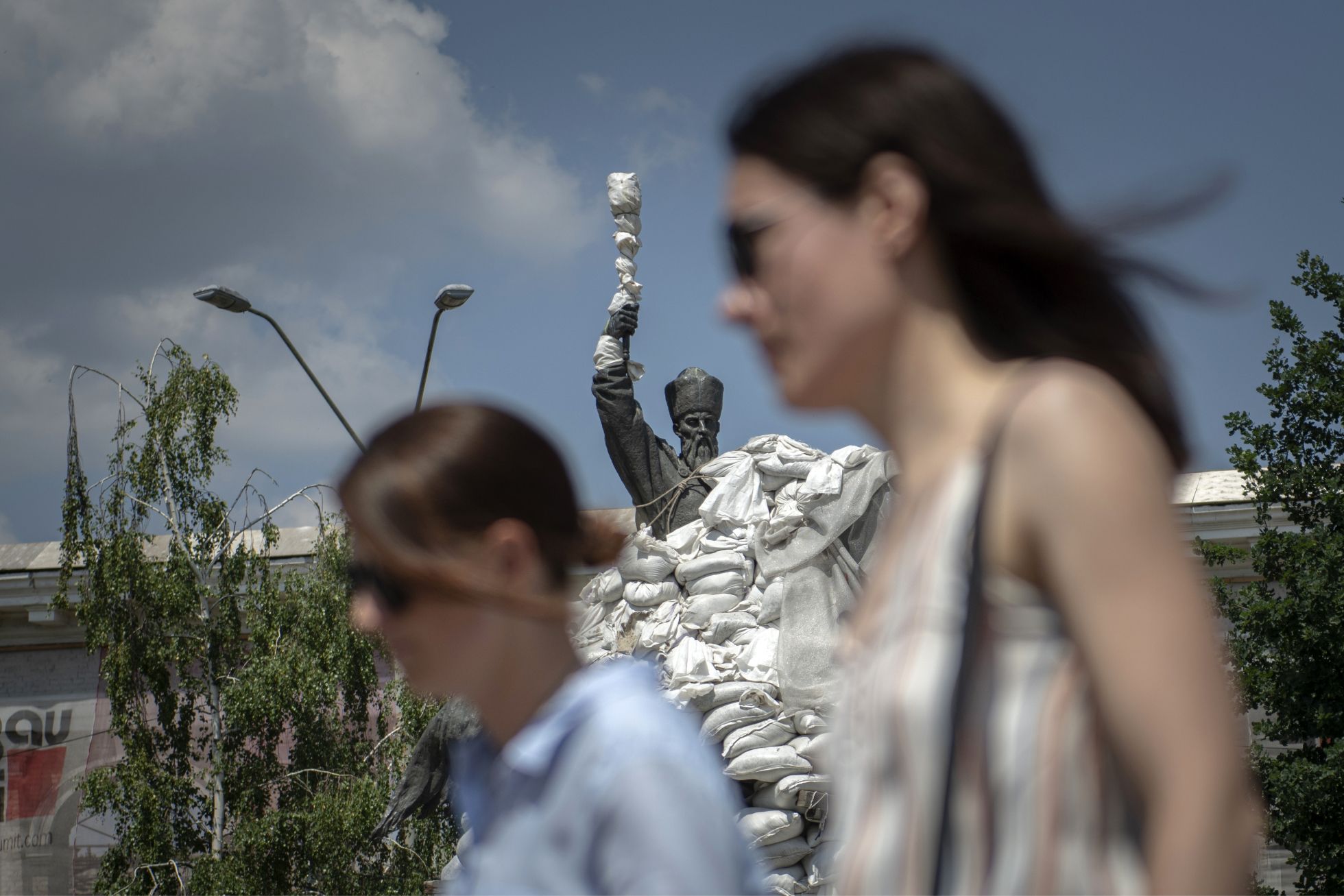 Монумент обложен мешками с песком для защиты при обстрелах.