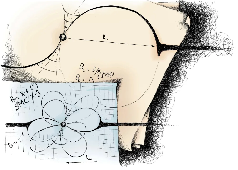 Рентгеновские пульсары — это аккрецирующие нейтронные звезды с сильным магнитным полем в тесных двойных системах. Самые яркие представители этого класса объектов уже были предметом нашего внимания на страницах ТрВ-Наука [1]. В таких объектах вещество звезды-компаньона, захваченное нейтронной звездой, ускоряется гравитационным полем последней до скоростей ~0,5c, достигает поверхности нейтронной звезды и высвечивает практически всю свою энергию (при таких скоростях это ~20% полной энергии покоя) в рентгене [2]. Магнитные поля нейтронных звезд в рентгеновских пульсарах, которые и определяют рентгеновские пульсары как класс объектов, невероятно сильны: на поверхности это 1012–1013 Гс, а то и больше. Напряженность поля на поверхности звезды удается уверенно измерять по положению циклотронных линий в спектре, если такие там обнаруживаются [3]. Появление циклотронных линий связано c тем, что энергия движения электрона поперек магнитного поля квантуется, а переходы электронов между энергетическими уровнями приводят к появлению резонансов в сечениях рассеяния и поглощения. Самые сильные поля, которые удается получить в наземных лабораториях, в сотни тысяч раз слабее тех, что мы фиксируем в рентгеновских пульсарах. Отсюда и интерес к этим объектам: декодируя информацию, зашифрованную в их спектрах, поляризации и пр., мы можем наблюдать поведение вещества в условиях сверхсильных магнитных полей. Магнитное поле полностью определяет геометрию аккреционного потока около нейтронной звезды в рентгеновских пульсарах: поток вещества в виде ветра или диска (далее мы будем подразумевать, что аккреция происходит из диска) разрушается магнитным полем на расстоянии около ста радиусов нейтронной звезды (~108 см). Дальше вещество следует силовым линиям поля и достигает поверхности около магнитных полюсов. Почти всё рентгеновское излучение рождается тут, в непосредственной близости от поверхности. Сам аккреционный поток если и излучает, то в основном в оптике или в ультрафиолетовом диапазоне (на эти диапазоны приходится лишь малая часть общей светимости системы: ~1%).