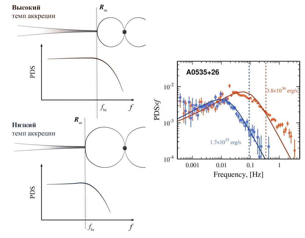 Внутренний радиус аккреционного диска в наших объектах, т. е. то расстояние, на котором магнитное поле нейтронной звезды становится достаточным для того, чтобы разрушить диск, зависит от напряженности магнитного поля и от темпа аккреции: чем сильнее поле, тем дальше от нейтронной звезды оно разрушает поток, но чем больше на нейтронную звезду валится вещества, тем ближе диск может подобраться к ней. Если темп аккреции на нейтронную звезду по каким-то причинам меняется, то меняется и положение внутреннего края. Именно это мы и видим на рис. 3: в ярком состоянии, с большим темпом аккреции диск подбирается ближе к нейтронной звезде, и спектр мощности пульсара смещен в сторону высоких частот по отношению к спектру мощности того же источника в состоянии с меньшими темпами аккреции. Для пульсара A0535+26 надежно (по положению циклотронных линий) измерена напряженность магнитного поля на поверхности, а значит, можно оценить положение внутренней границы диска при разных темпах аккреции. Положение слома в спектре мощности смещается с изменение темпа аккреции так же, как меняется частота динамо на внутренней границе диска. Мало того, знание кеплеровской частоты на внутреннем крае позволяет оценить коэффициент пропорциональности между динамическим временем и временем развития турбулентного динамо [8]. Получается, что спектр мощности шума несет в себе информацию о геометрии аккреционного потока и о физике вязкости в диске. Обнаружение же слома в спектре мощности позволяет независимым образом оценить расстояние, на котором диск разрушается магнитным полем, а стало быть, и косвенно измерить магнитное поле нейтронной звезды. Это особенно важно, если другие методы измерения поля не работают.
