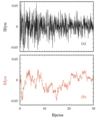 Попробуем немного разобраться с шумами. Шумы могут быть разными в том смысле, что в них могут преобладать те или иные характерные времена переменности: представьте себе шум того же поля, полного цикад, и шум прибоя. Сравните также шумы, представленные графически на рис. 2. Видно, что в случае (a) характерные времена переменности короче, в шуме преобладают высокие частоты по сравнению со случаем (b). Из-за того, что шум как процесс развивается во времени до известной степени непредсказуемо, исследовать его оказывается намного удобнее, анализируя его частотные свойства: легче сказать, какие времена (частоты) переменности преобладают, чем предсказать, как именно будет развиваться шумовой процесс в следующее мгновение. Технически для исследования частотных свойств к сигналу, разворачивающемуся во времени, применяют преобразование Фурье. Абсолютная величина фурье-образа, возведенная в квадрат, дает так называемый спектр мощности (PDS, power density spectrum). Спектр мощности показывает, каким образом общая мощность процесса распределяется по разным фурье-частотам f или же по разным характерным временам переменности t=1/f. Спектры мощности по сути своей очень похожи на более привычные кому-то спектры электромагнитного излучения, с той разницей, что последние строятся на основе переменного во времени электромагнитного поля.