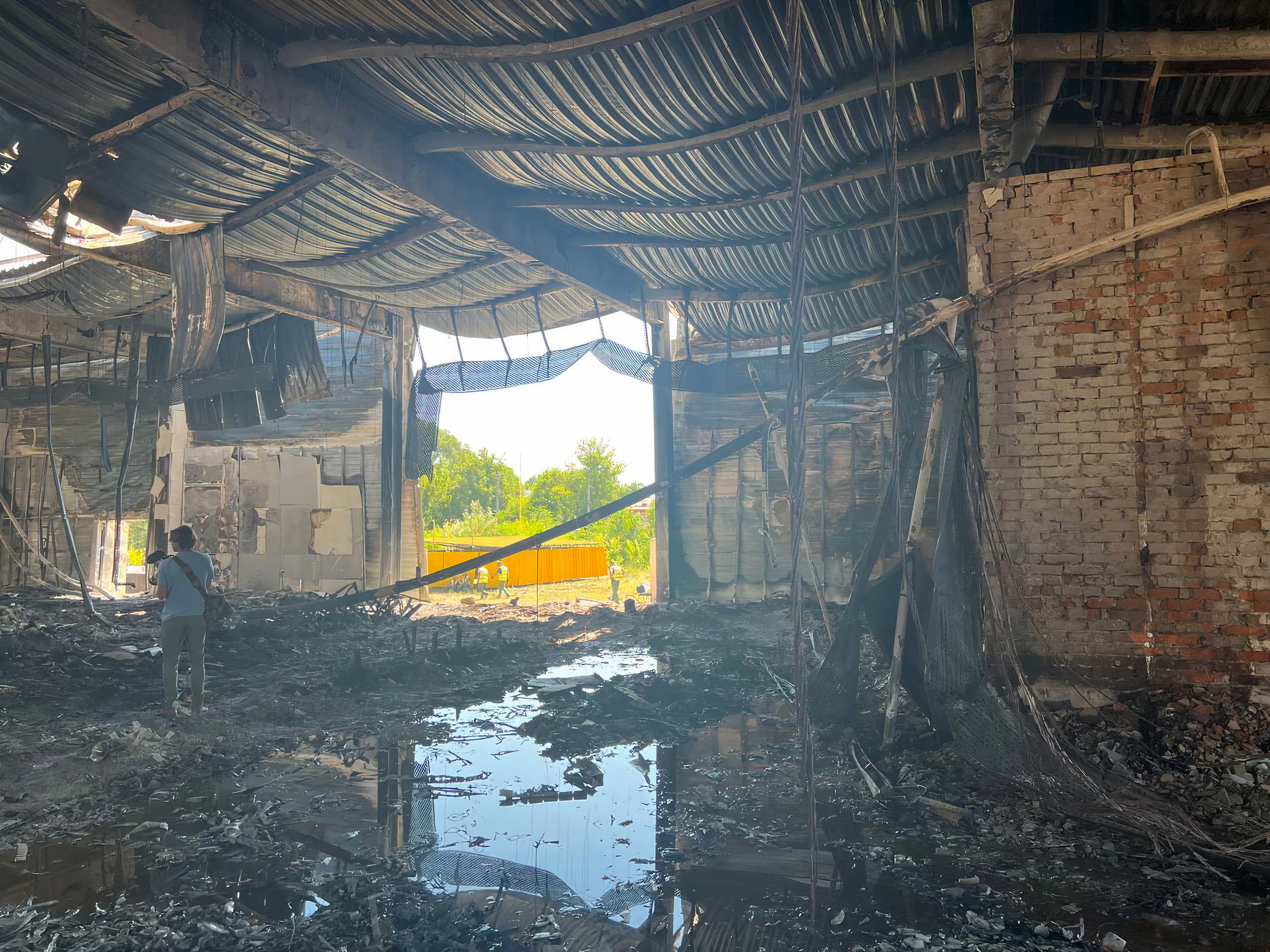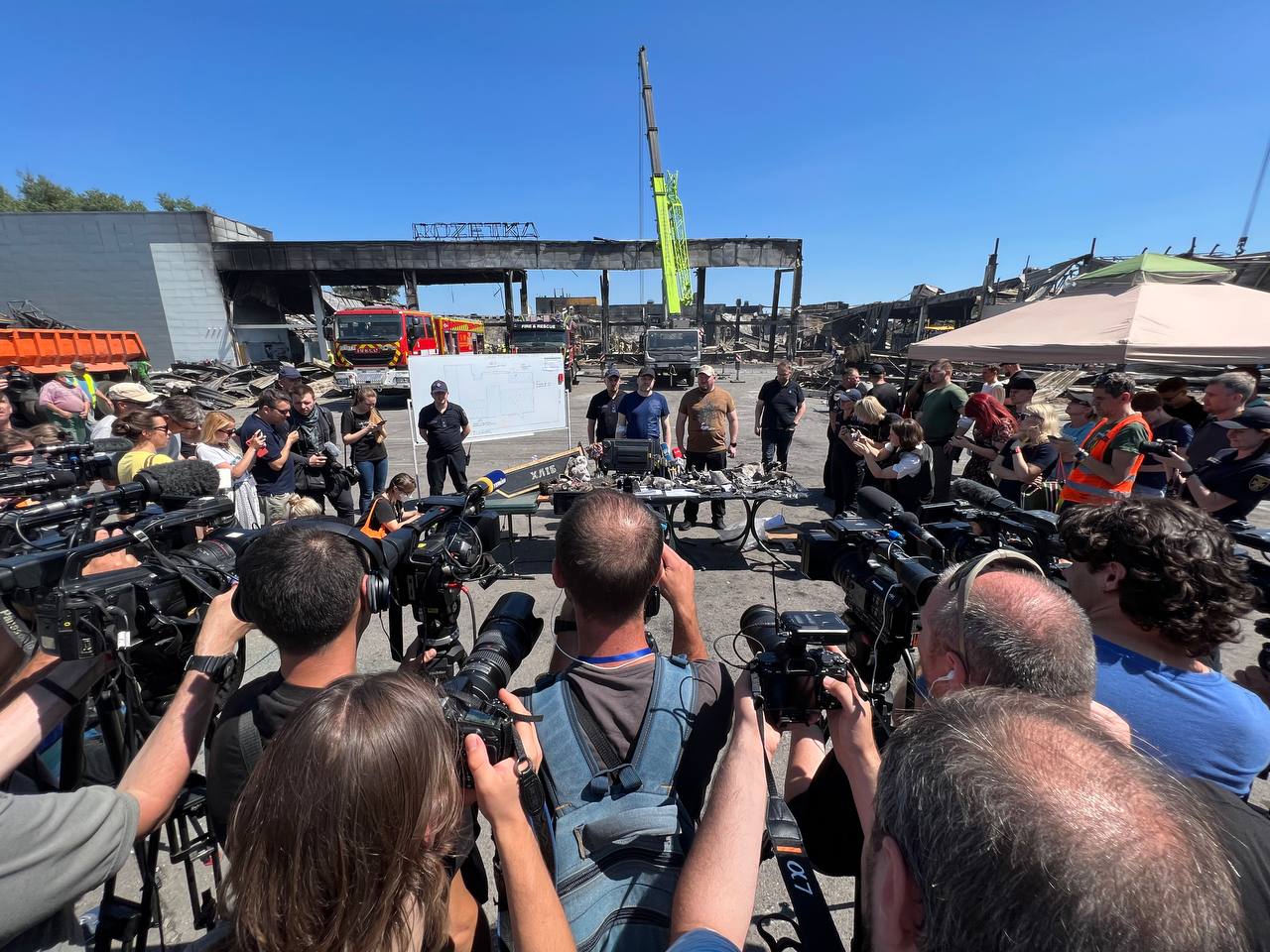 Журналисты на территории сгоревшего торгового центра «Амстор» в Кременчуге. Фото: Петр Рузавин / Медиазона