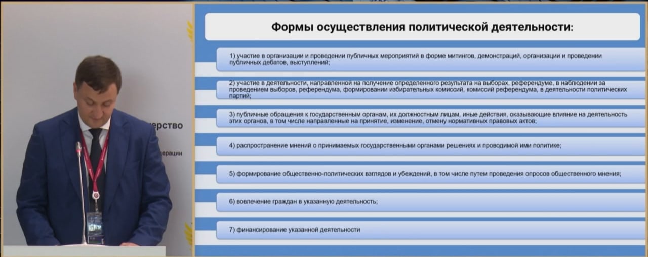 Лекцию на ПМЮФ-2022 провел замдиректора департамента по делам некоммерческих организаций Минюста Роман Цыганов. Все 30 минут чиновник читал текст с бумаги монотонным голосом.