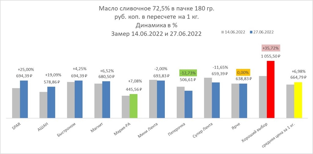 Цены фиксируют в сетях Spar, «Ашан», «Быстроном», «Магнит», «Мария-Ра», «Мини Лента», «Пятерочка», «Супер Лента», «Ярче» и «Хороший выбор».