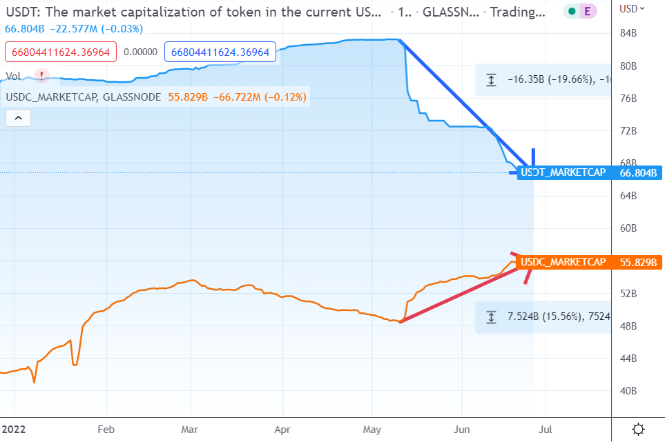 Сейчас мы как раз наблюдаем этот самый процесс: если по май 2022 года капитализация USDT неуклонно росла, то в последние два месяца она резко снизилась (почти на 20%). И это нельзя списать на общее сворачивание крипторынков: за этот же период USDC (главный стейбл-конкурент Tether) нарастил капитализацию на 15%.