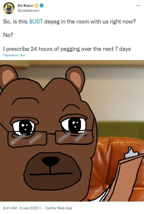 Вот, например, До Квон (основатель Luna/UST) искрометно шутит у себя в Твиттере 8 мая, за день до начала обвала UST: «А этот депег UST сейчас с нами в одной комнате? Нет? Прописываю вам 24 часа пеггинга!» (Если вы не знаете, что такое пеггинг, то гуглите осторожно — это контент для взрослых.)