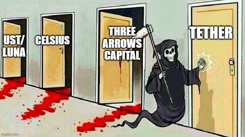 Криптозаморозки на рынке продолжаются. Практически каждые несколько недель громко лопается новый криптопроект на десятки миллиардов долларов: Luna/UST, Celsius, Three Arrows Capital. Есть основания полагать, что Tether/USDT может последовать их примеру.
