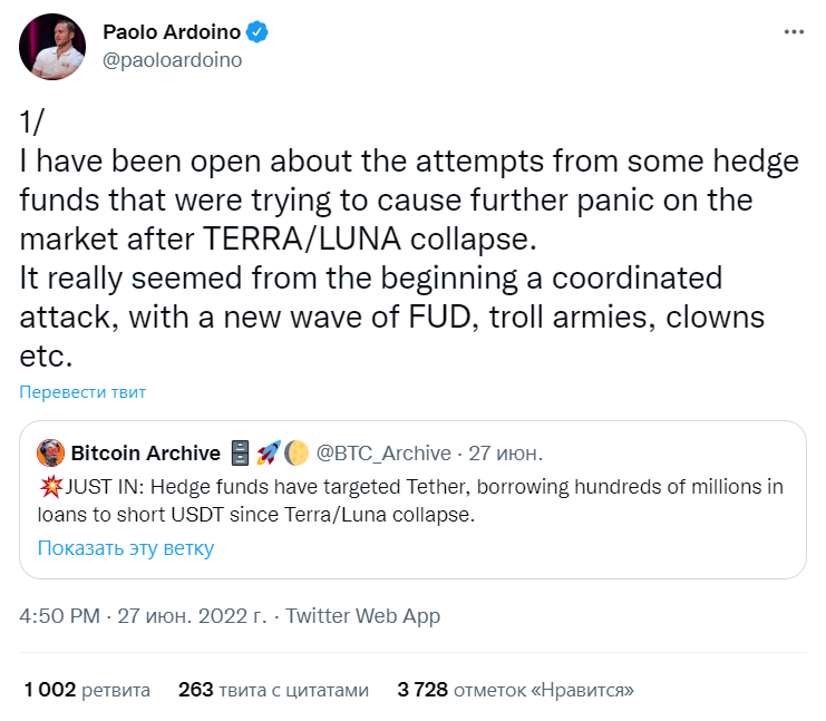 Паоло Ардоино, технический директор Tether, отреагировал на эту новость довольно болезненно: разразился твиттер-тредом с общим посылом на тему «вывсёврети, дела у Tether как никогда прекрасны — и вообще, злые силы нас гнетут, а мы крепчаем!!»