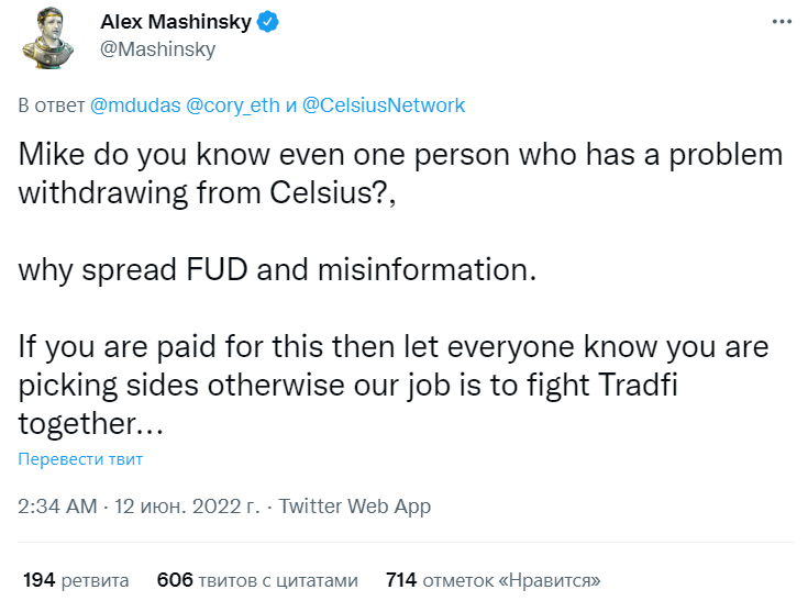 А вот Алекс Машинский (основатель Celsius) негодует в твиттере 12 июня: «Да вы знаете хоть одного человека, у которого есть проблемы с выводом средств из Celsius?!» Что ж, до конца того же дня проблемы с возвратом денег возникли одновременно у всех клиентов Celsius: платформа заморозила все выводы, да так с тех пор и не разморозила (а сейчас вообще идут переговоры о способе банкротства).