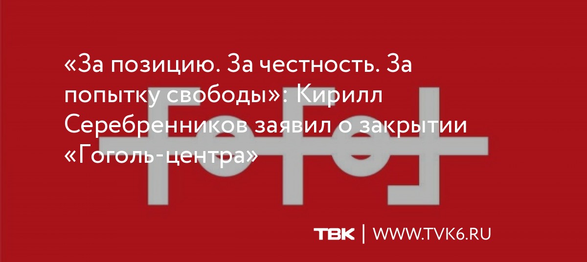 *Отметим, Кирилл Серебренников занимал пост художественного руководителя Московского драматического театра им. Н. В. Гоголя с августа 2012 года. В сентябре он объявил о реформе театра, и с октября театр перестал работать: все спектакли из репертуара были сняты, а на его месте властями Москвы был создан «Гоголь-центр» – от открылся в феврале 2013 года.