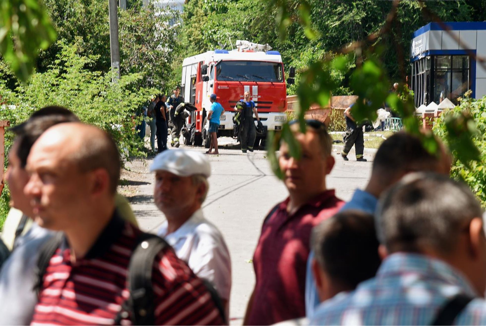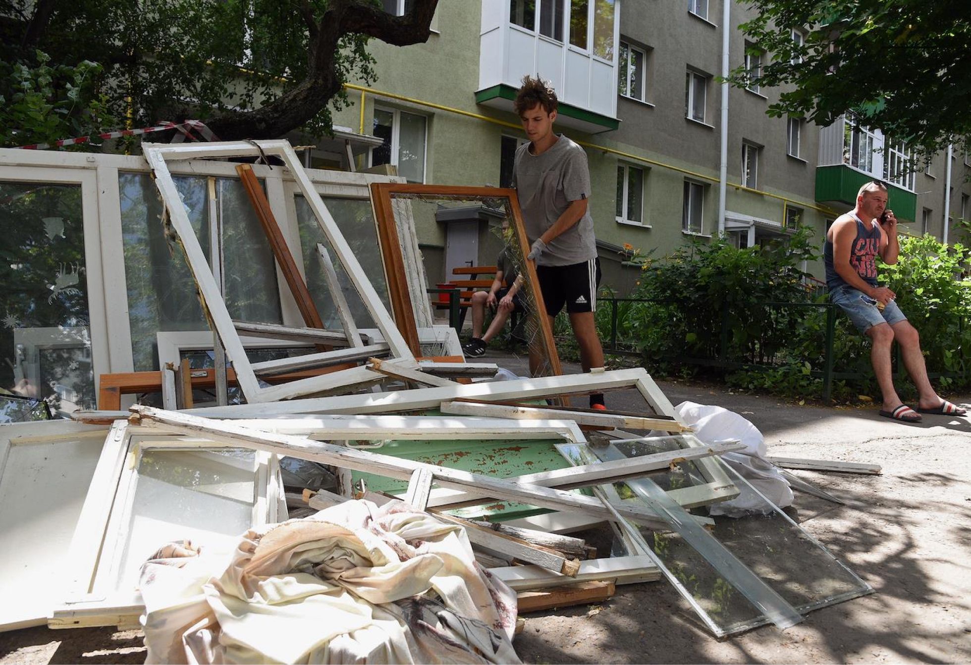 По двору ходят полицейские и сотрудники МЧС, пока рабочие — на них нет специальной формы — с громким лязгом бросают в мусорный контейнер стекла. Из подъезда одного из поврежденных многоквартирных домов выходят двое мужчин — на одном синяя жилетка спасательной службы, в руках у другого — блокнот.