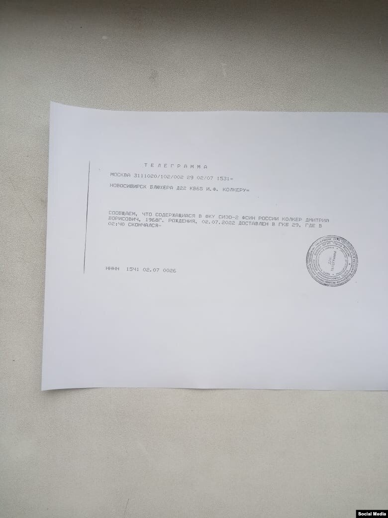Родственников о гибели Дмитрия Борисовича известили официальной телеграммой. "Сообщаем, что содержащийся в ФКУ СИЗО-2 ФСИН России Колкер Дмитрий Борисович, 1968 года рождения, 2 июля доставлен в ГКБ №29, где в 2:40 скончался", – говорится в сообщении.