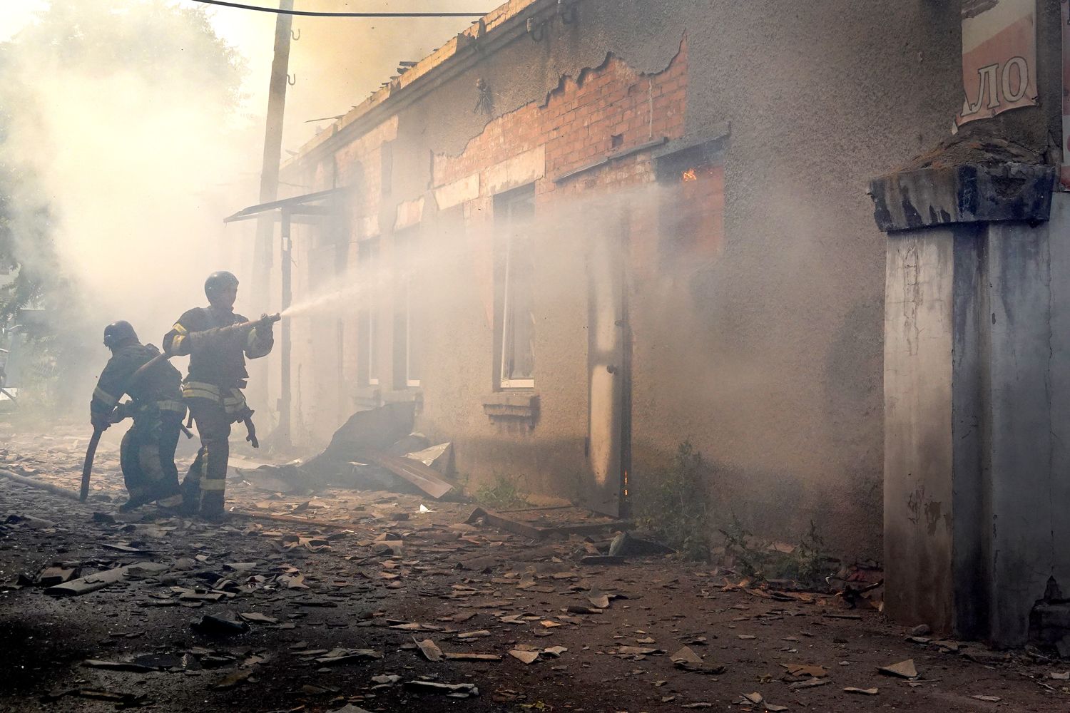 Пожарные в Славянске тушат огонь в доме, в который попала ракета