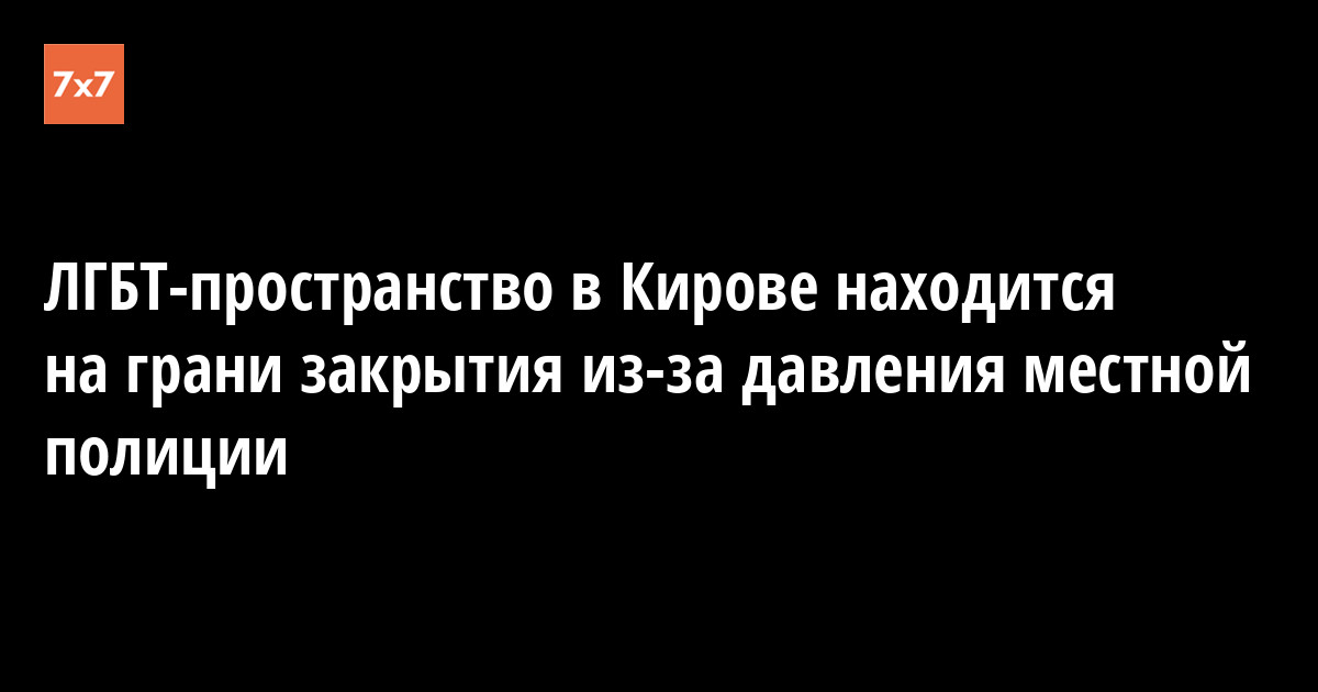 Единственный ЛГБТ-френдли-клуб терпит большие убытки из-за давления местных полицейских. Пространство регулярно проверяют на гей-пропаганду, наркотики и проституцию (название клуба не раскрывается в целях безопасности), а на активистов пишет доносы местный житель. Об этом «7х7» сообщила координатор мониторинга дискриминации по Кировской области от Российской ЛГБТ-сети Полина Кускова.