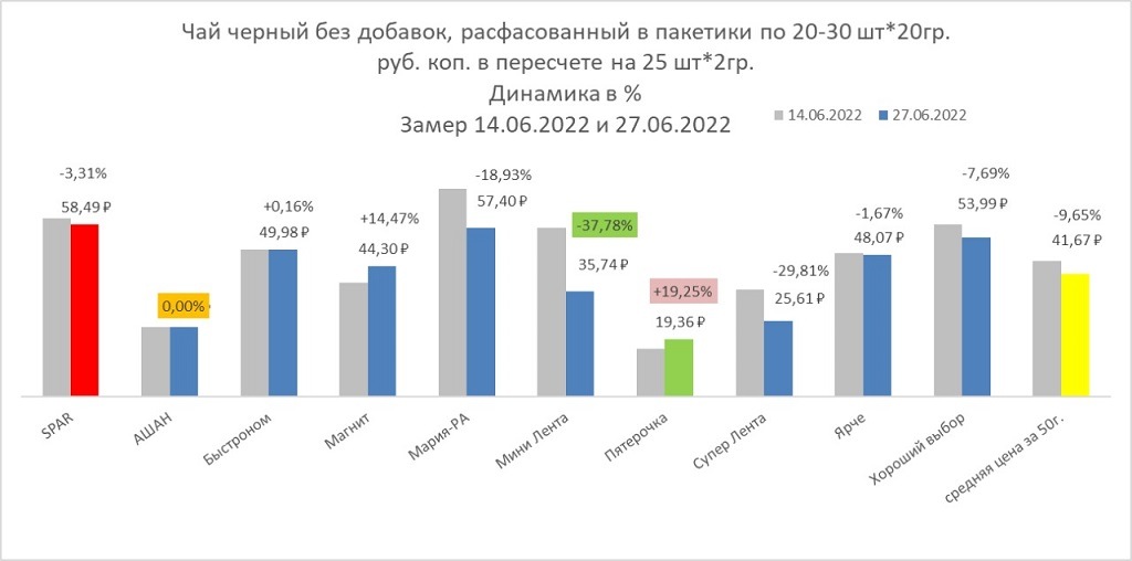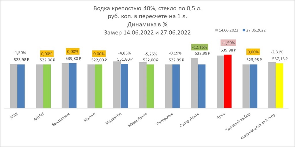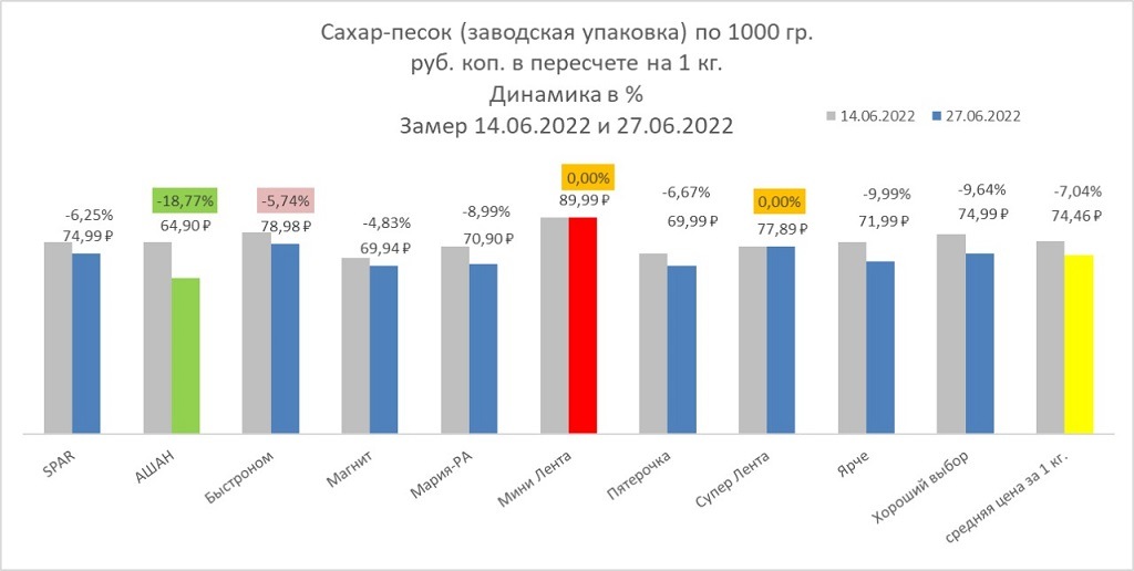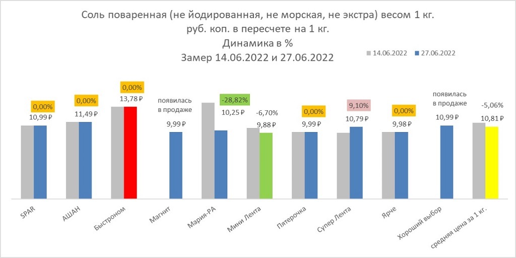 Мониторинг проводился в 20 торговых точках во всех районах города. Сравниваем цены за 14 июня и 27 июня.