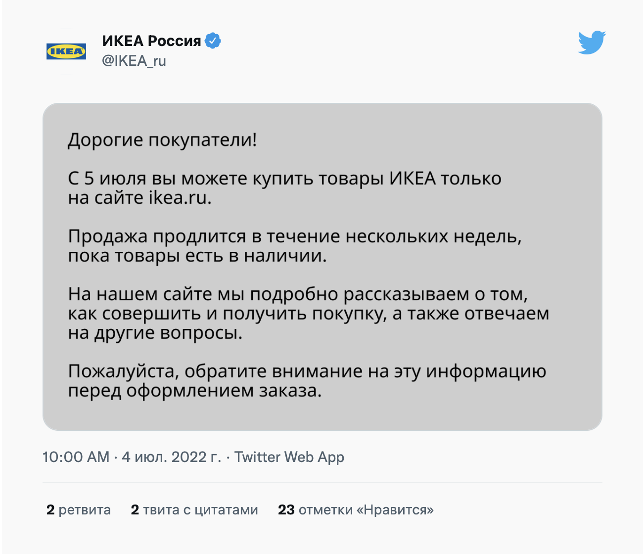 В ночь на 5 июля на российском сайте IKEA началась финальная распродажа, объявленная перед уходом компании из России. Компания сообщила о готовящейся акции утром 4 июля, подчеркнув, что она будет продолжаться «в течение нескольких недель, пока товары есть в наличии». Ранее IKEA провела распродажу для своих сотрудников — и она проходила непосредственно в магазинах сети.