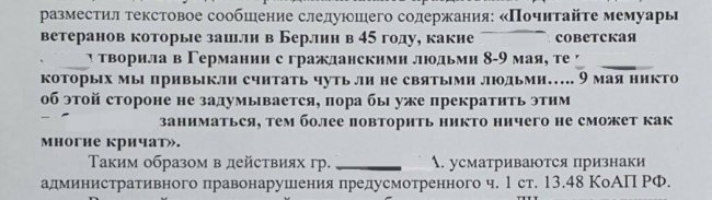 Мужчина предложил собеседникам почитать мемуары ветеранов, вошедших в Берлин в 1945 году. Скриншоты переписки попали к сотрудникам Центра «Э». Мужчину вызвали в отдел полиции на беседу.