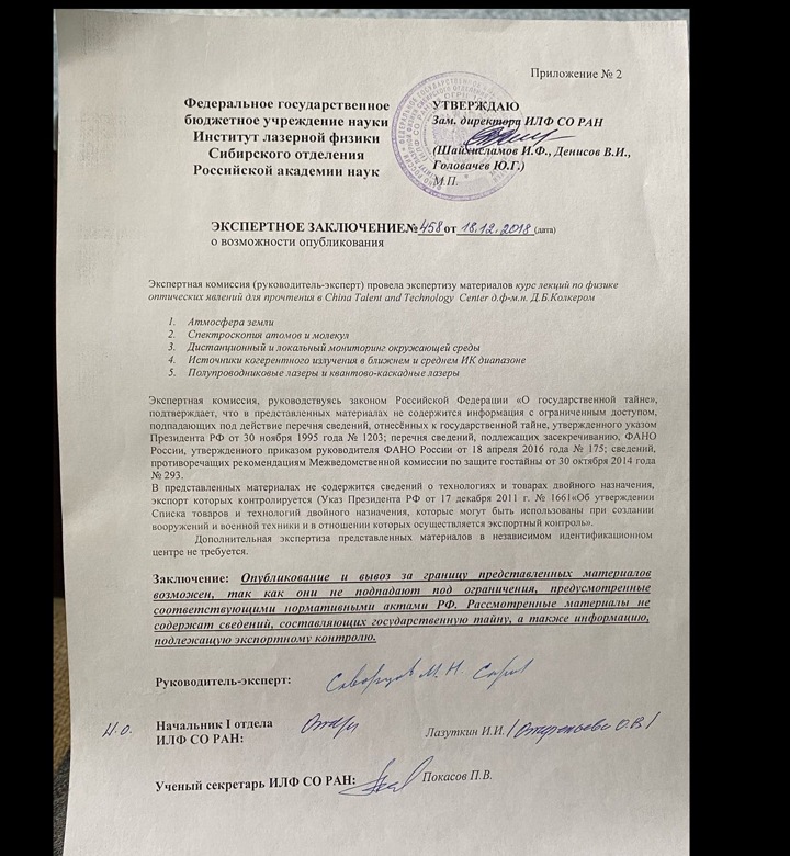 «Клуб 1 июля» также опубликовал экспертное заключение, которое допустило лекции Колкера для китайских студентов. Оно, в частности, подписано и.о. начальника первого отдела Института лазерной физики СО РАН , который возглавлял Лазуткин И. И., а также ученым секретарем ИЛФ СО РАН Павлом Покасовым и неким руководителем-экспертом.