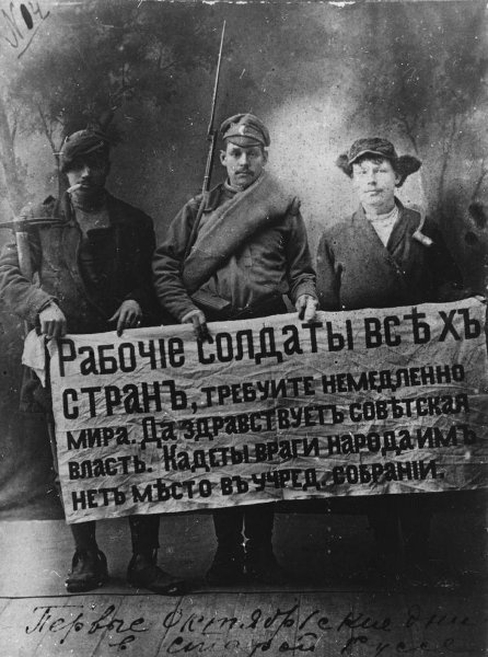 Надпись на транспаранте: «Рабочие солдаты всех стран, требуйте немедленно мира. Да здравствует советская власть. Кадеты враги народа им нет место в учред. собрании». Надпись на фотографии: «Первые октябрьские дни в Старой Руссе».