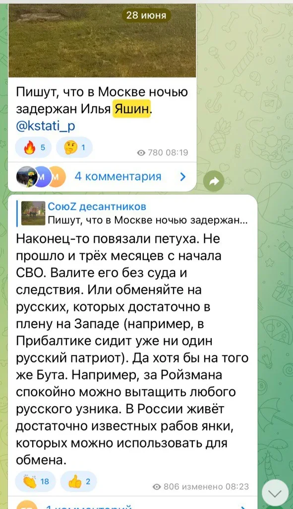 The message says: “Finally, he has been caught. Only three months have passed since the start of the Special Military Operation. Deal with him without any trial. Or exchange him for Russians, there are enough of them imprisoned in the West. <...> Enough of Yankees’ slaves live in Russia, they can be used for prisoner exchange.”