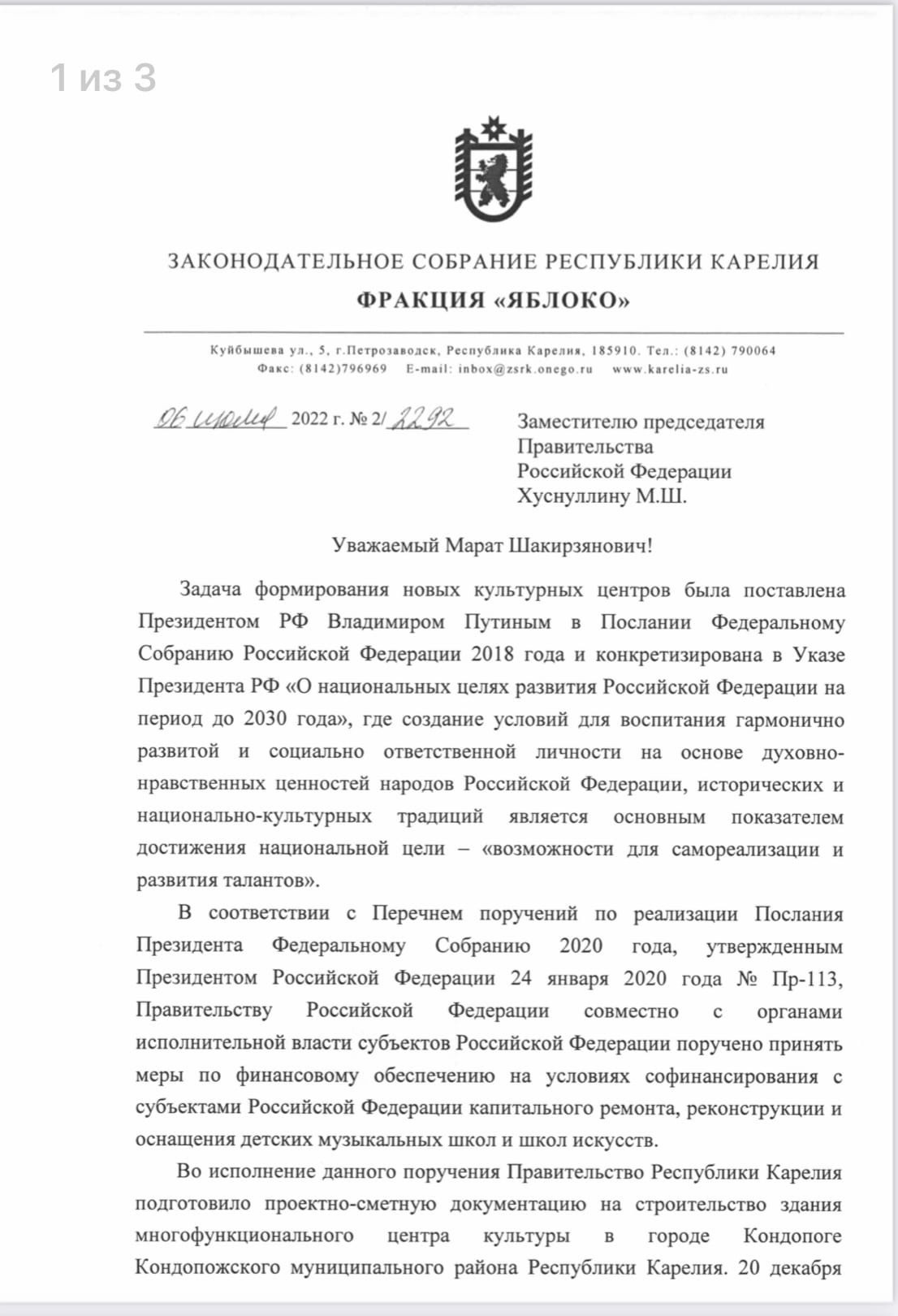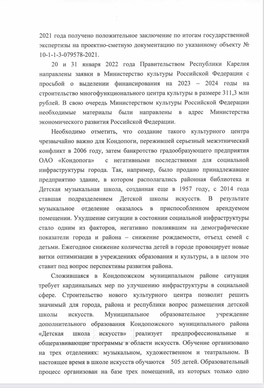 Сразу же, в связи с полученным ответом, отправили от фракции «Яблоко» обращения вице-премьеру правительства РФ М. Хуснуллину и министру экономического развития РФ М. Решетникову о важности/необходимости выделения средств на строительство детской школы искусств в Кондопоге.