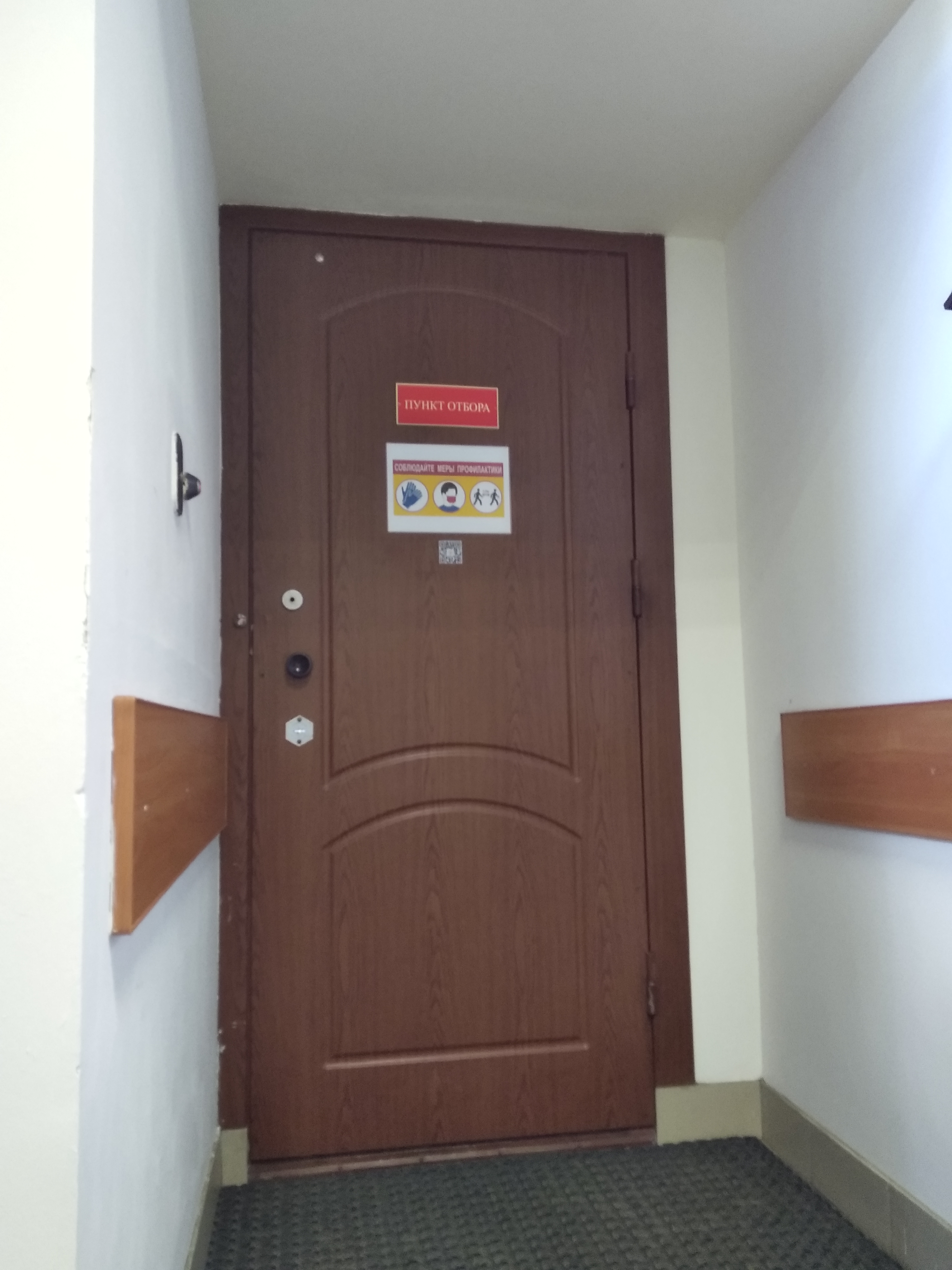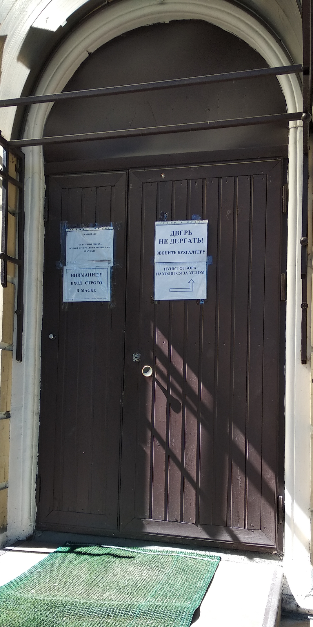 На боковом входе в здание штаба листки с надписями "Дверь не дергать! Пункт отбора находится за углом". Информацию дополняет изогнутая стрелка, объясняющая, как пройти за угол.