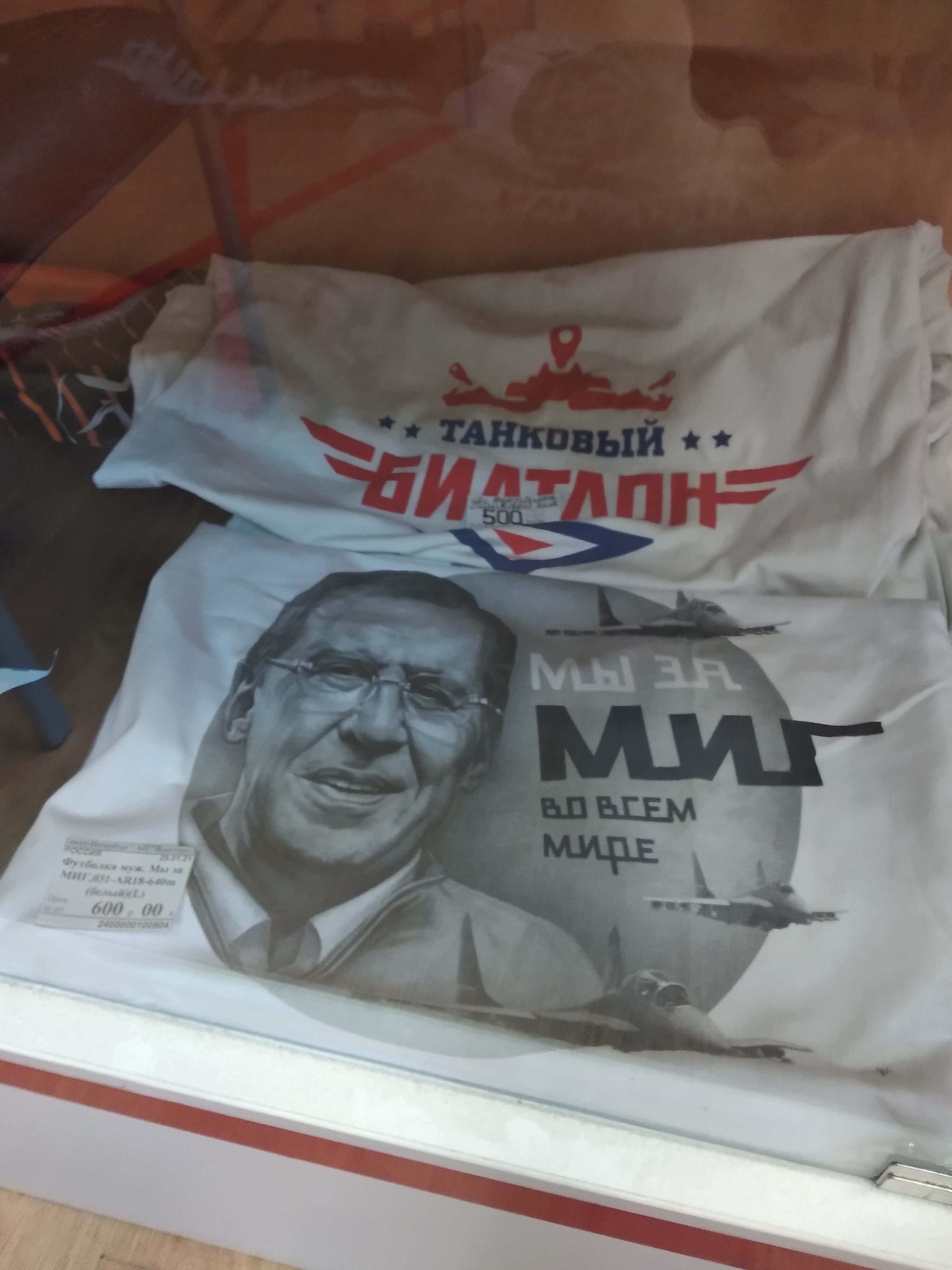Общение с инструктором заняло не больше 20 минут. В комнате ожидания за это время появилось еще несколько человек. Уходя, рядом со шкафчиком, в который посетители складывают свои телефоны, я заметил стеклянные полки с патриотической сувенирной продукцией. На футболке с изображением улыбающегося министра иностранных дел Сергея Лаврова и надписью "Танковый биатлон" красуются несколько военных истребителей и девиз "Мы за МИГ во всем мире", цена 600 рублей.