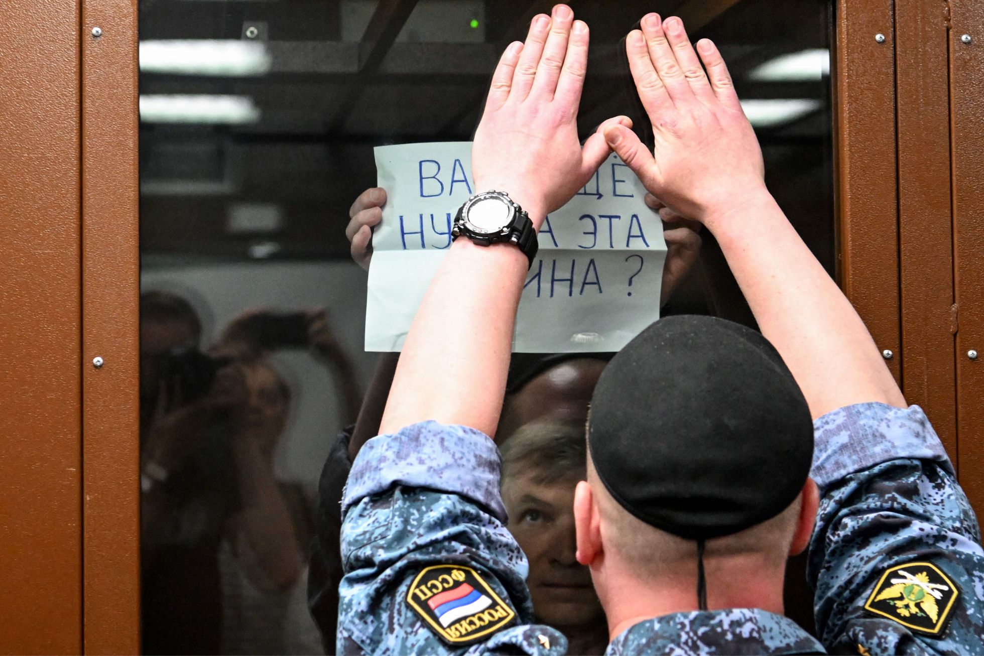 «Вам еще нужна эта война?» — аккуратно, печатными буквами выведено на помятом листе бумаге. Его, прижав к стеклу камеры в Мещанском суде, держит муниципальный депутат Алексей Горинов.