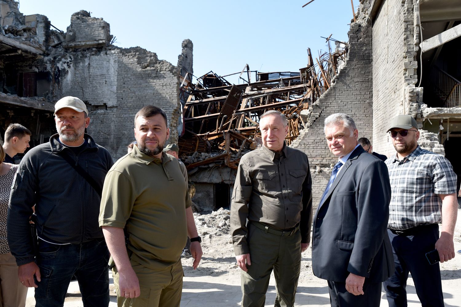 Николай Тришин / ТАСС Заместитель председателя комитета Госдумы РФ по обороне Дмитрий Саблин, глава самопровозглашенной ДНР Денис Пушилин, губернатор Санкт-Петербурга Александр Беглов и «мэр» Мариуполя Константин Иващенко. Мариуполь, 1 июня 2022 года