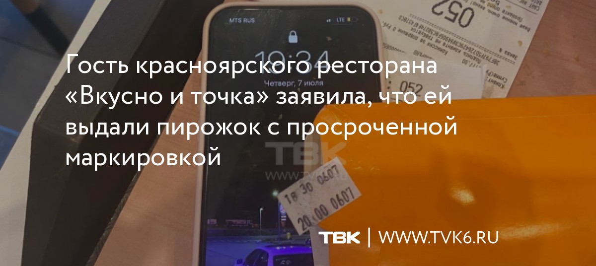 Как рассказала красноярка, пирожок со «вчерашней» маркировкой ей продали в ресторане на Авиаторов. На продукте была наклейка за 6 июля, а девушка посетила «Вкусно и точка» 7 числа.