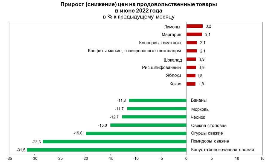 Значительное влияние на динамику цен на продовольственные товары оказало удешевление плодоовощной продукции. Так, например, капуста белокочанная, по данным статистиков, подешевела на 31,5%, помидоры — на 28,3%, огурцы — на 19,8%, свекла — на 15,0%.