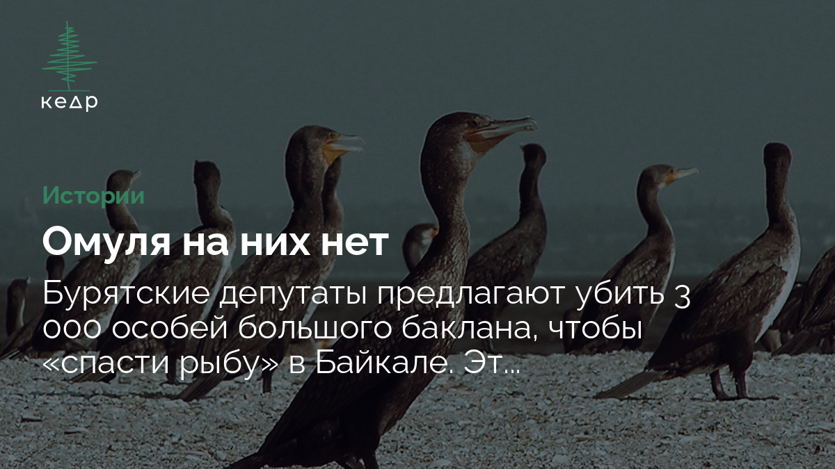 Народный Хурал Бурятии обратился в республиканское министерство природных ресурсов с предложением за полгода уничтожить около 3 000 особей большого баклана. Инициативу объяснили тем, что птица «ежегодно поедает до тысячи тонн ценного и охраняемого байкальского омуля», препятствуя его размножению. А ведь рост популяции этой рыбы — одна из задач национального проекта «Экология».