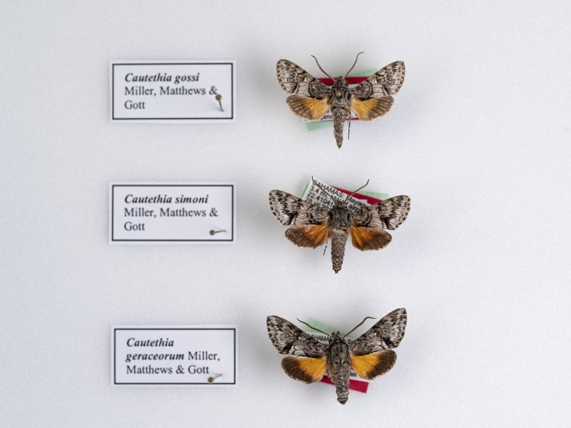 Новые виды обнаружили энтомологи Дебора Мэтьюз (Deborah Matthews) и Жаклин Миллер (Jacqueline Miller), разбирая коллекции бабочек, собранные на Багамских островах. По деталям строения некоторых экземпляров они заподозрили, что обнаружили сразу три новых вида, но окончательно убедиться в этом смогли после анализа последовательностей ДНК, который провел Райли Готт (Riley J. Gott). Все три вида принадлежат к роду Cautethia. Бабочка Cautethia gossi встречается на острове Большой Инагуа, Cautethia geraceorum — на острове Сан-Сальвадор, а бабочка Cautethia simoni была поймана на острове Маягуана в Багамском архипелаге и на островах Гранд-Тёрк и Провиденсьялес в соседнем архипелаге Тёркс и Кайкос. Длина переднего крыла у этих видов составляет 13–15 миллиметров. Детали образа жизни этих бражников неизвестны, но по аналогии с их ближайшими родственниками можно предположить, что их гусеницы питаются растениями семейства мареновых.