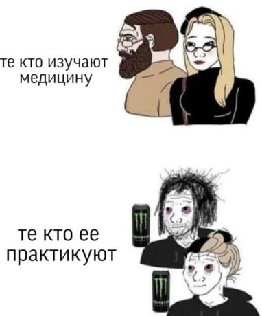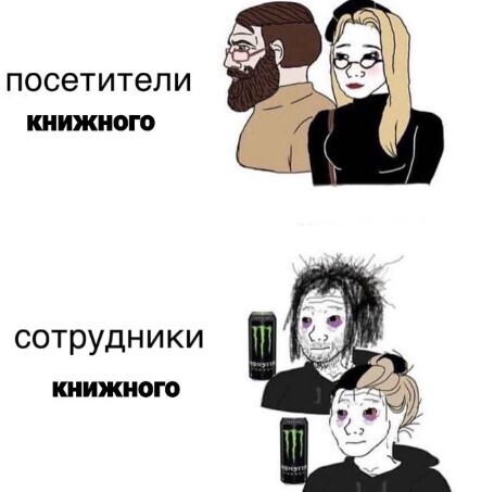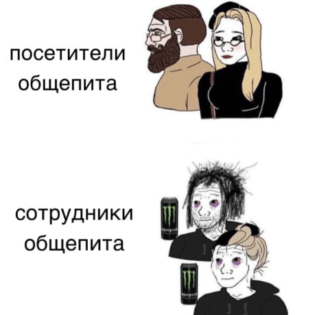 В российском твиттере распространился мем, где клиентов и потребителей сравнивают с работниками сферы услуг и создателями контента. Если первые изображены как утончённые Чад и его девушка, то вторые — растрёпанные и уставшие думеры, пьющие энергетики Monster.