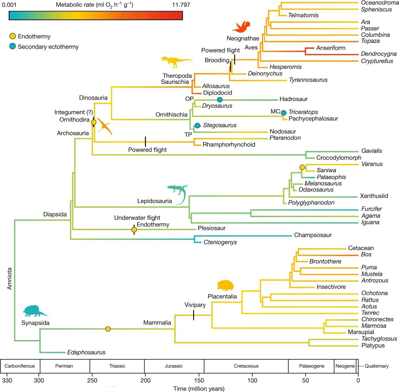 Совсем уж неожиданно, что в число эндотермов попадают вымершие представители ящериц-варанидов из рода Saniwa; авторы робко называют это факультативной эндотермией. Кажется, эта странность прямо указывает на ограниченность использованного метода. В организме выявляются окисленные молекулы, которые должны свидетельствовать о том, что метаболизм животного достаточно развит, чтобы вырабатывать тепло самостоятельно, — по сути, мы узнаём об интенсивности использования животным кислорода. Конечно, это важно, но само по себе увеличение аэробной способности еще не означает, как мы видим в случае с варанами и их родичами, что существо действительно эндотермно.