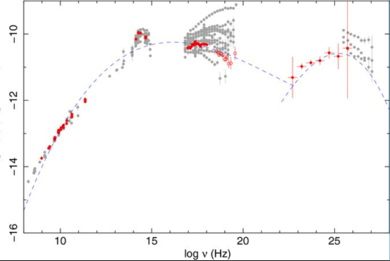 Рис. 4Б Рис. 4. Спектральное распределение энергии двух блазаров разных типов. Сверху (А) — мощнейший насыщающийся блазар 3С454.3. Снизу (Б) — один из ярчайших лацертид, или голодающих блазаров, довольно близкий (z = 0.033). Спектры не одновременные, что выражается разными сериями точек на одной энергии. «Шишка» в интервале 1014–1015 Гц на нижнем спектре — родительская галактика. 1025 Гц соответствует энергии 40 ГэВ. Пунктир — результат расчетов по примитивной модели, не него можно не обращать внимания