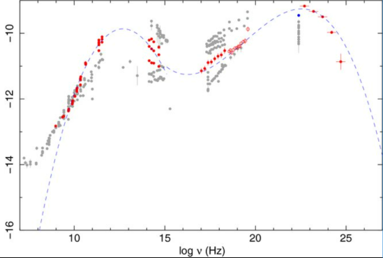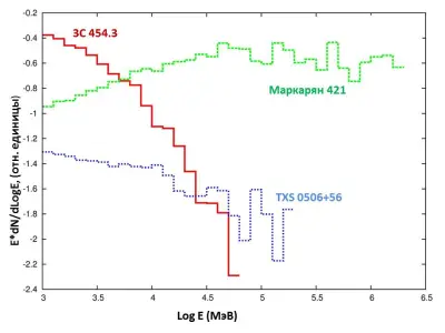 Поток гамма-квантов от блазаров по мощности достигает 1050 эрг/с, если считать, что источник изотропен. Это предположение, конечно, неверно: блазар светит прямо на нас, как луч прожектора, и реальная мощность порядка на три ниже, что всё равно на три порядка превосходит полную светимость нашей Галактики. При этом регистрируемый электромагнитный спектр блазаров простирается на 20 порядков величины — от радиоволн до ТэВ-ных гамма-квантов. Спектры блазаров, как правило, рисуются в виде так называемого спектрального распределения энергии — как мощность потока фотонов распределена по логарифму энергии (он отличается от обычного спектра dN/dE множителем Е2). На рис. 4А видно, что для некоторых объектов основная мощность излучается в ГэВ-ных фотонах. Это стало большим сюрпризом, когда запустили первую мощную космическую гамма-обсерваторию «Комптон».