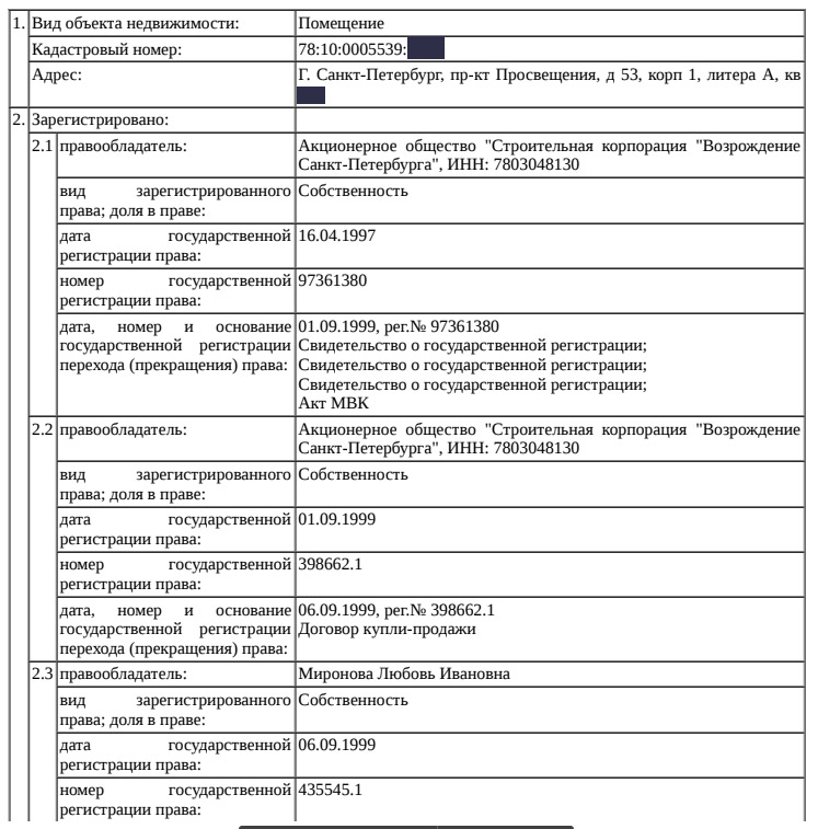 Сначала эта квартира находилась в оперативном управлении «Управления по эксплуатации жилого фонда» Управделами президента. Можно было бы подумать, что Мироновы, как часто бывает, просто приватизировали служебную квартиру, которая предоставлялась главе семейства как лицу, замещающему госдолжность, но в декларациях эта квартира никогда не указывалась — ни в пользовании, ни в собственности.