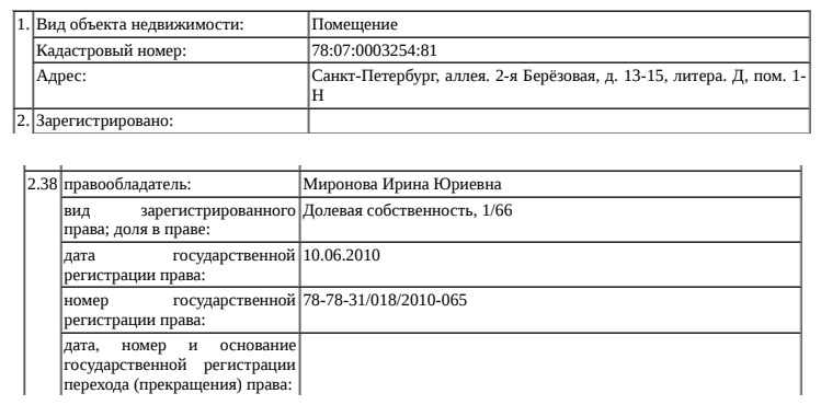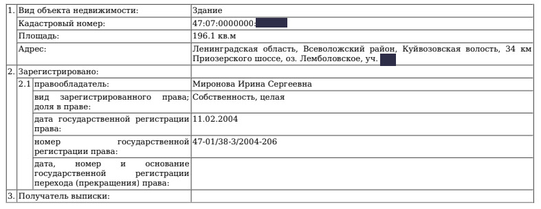 И возможности его, судя по активам, записанным на жену, тоже увеличились. Спустя несколько лет после развода Захарова работала всего лишь специалистом 1-й категории отдела потребительского рынка администрации Невского района Петербурга, декларируя доход в 500 тысяч рублей в год. Но при этом она владеет имуществом в доме на Крестовском острове по адресу: 2-я Березовая аллея, 13-15. В собственности у Захаровой — доля земельного участка, гаража и, видимо, квартира в 251,5 кв.м. В предвыборной декларации Миронова 2011 года эта квартира указана ещё в совместной собственности супругов и, видимо, потому её собственники в выписках Росреестра до сих пор засекречены. Дом этот непростой, среди соседей — люди, связанные с Путиным, и их родня: дочь бывшего премьера Виктора Зубкова, жена экс-депутата ЗакСа Сергея Никешина, Ротенберги, Фурсенко и супруга «массажиста» Путина Константина Голощапова. Стоимость квартир в здании может начинаться от 250 млн рублей (и есть подозрение, что ещё не каждому и продадут).