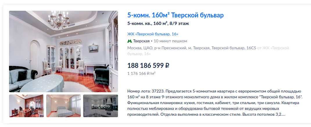Ещё один ценнейший актив третьей супруги Миронова — московская квартира в 133 кв. м в ЖК «Тверской бульвар, 16» в историческом центре столицы, с видом на Кремль и храм Христа Спасителя.