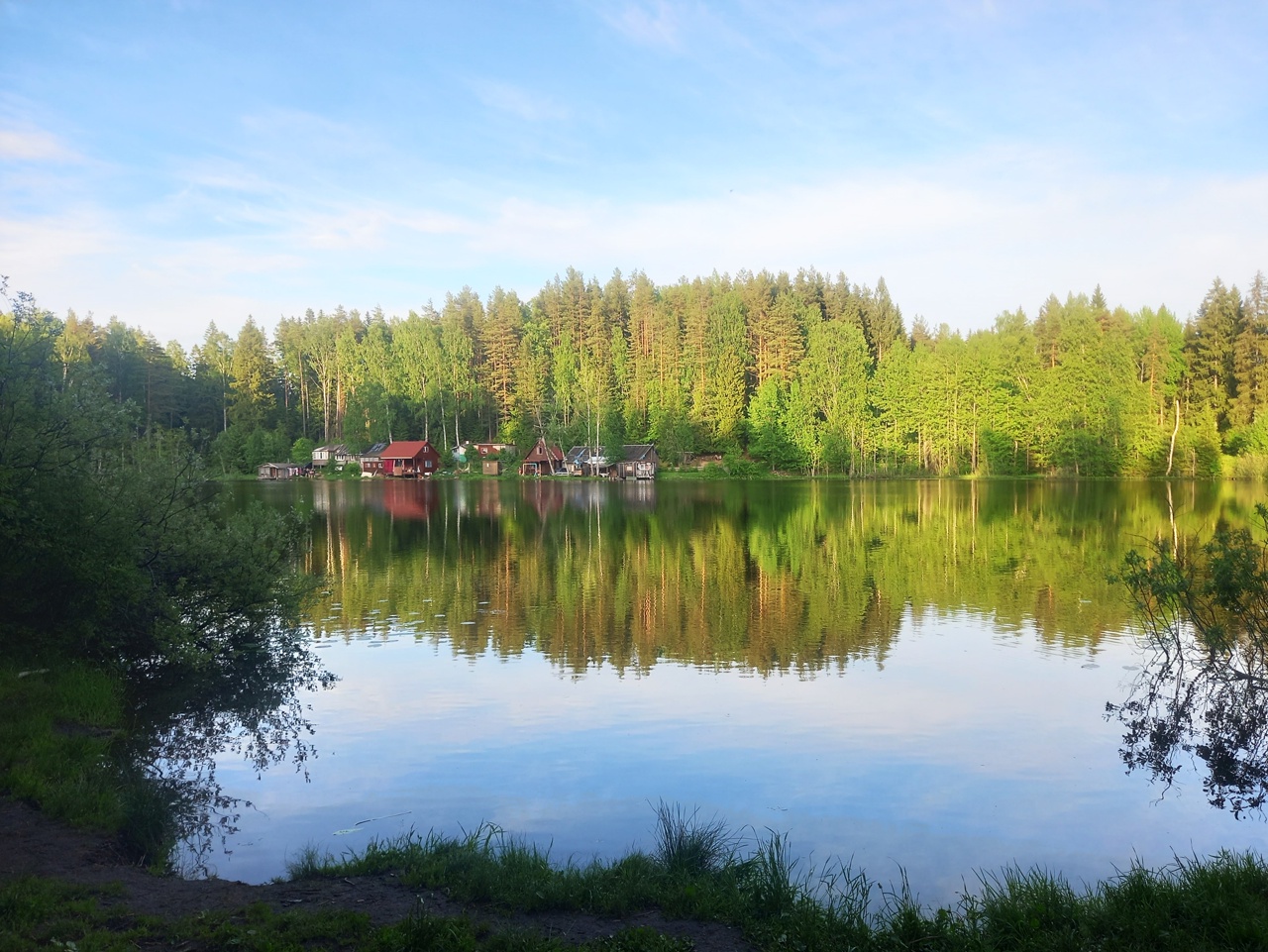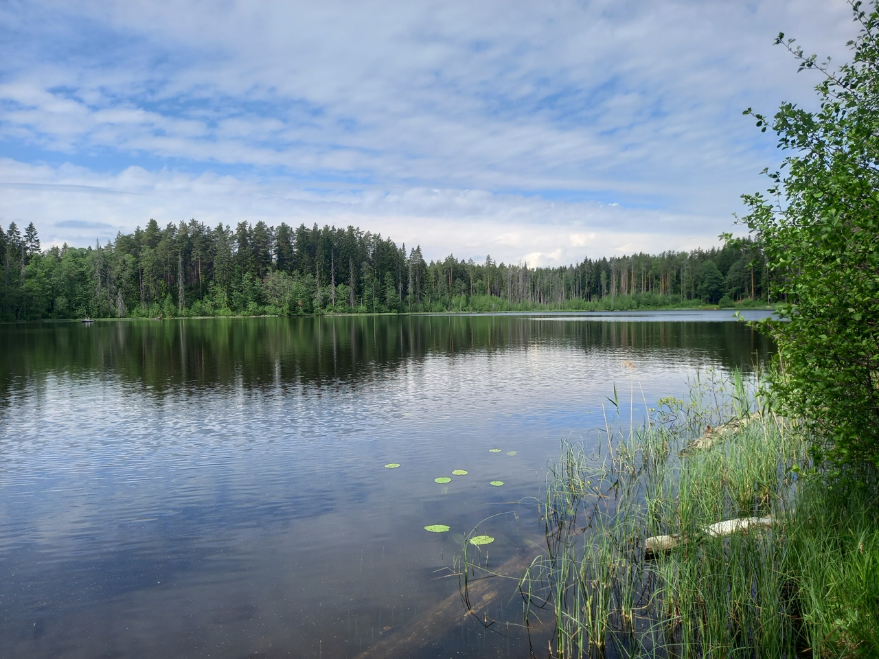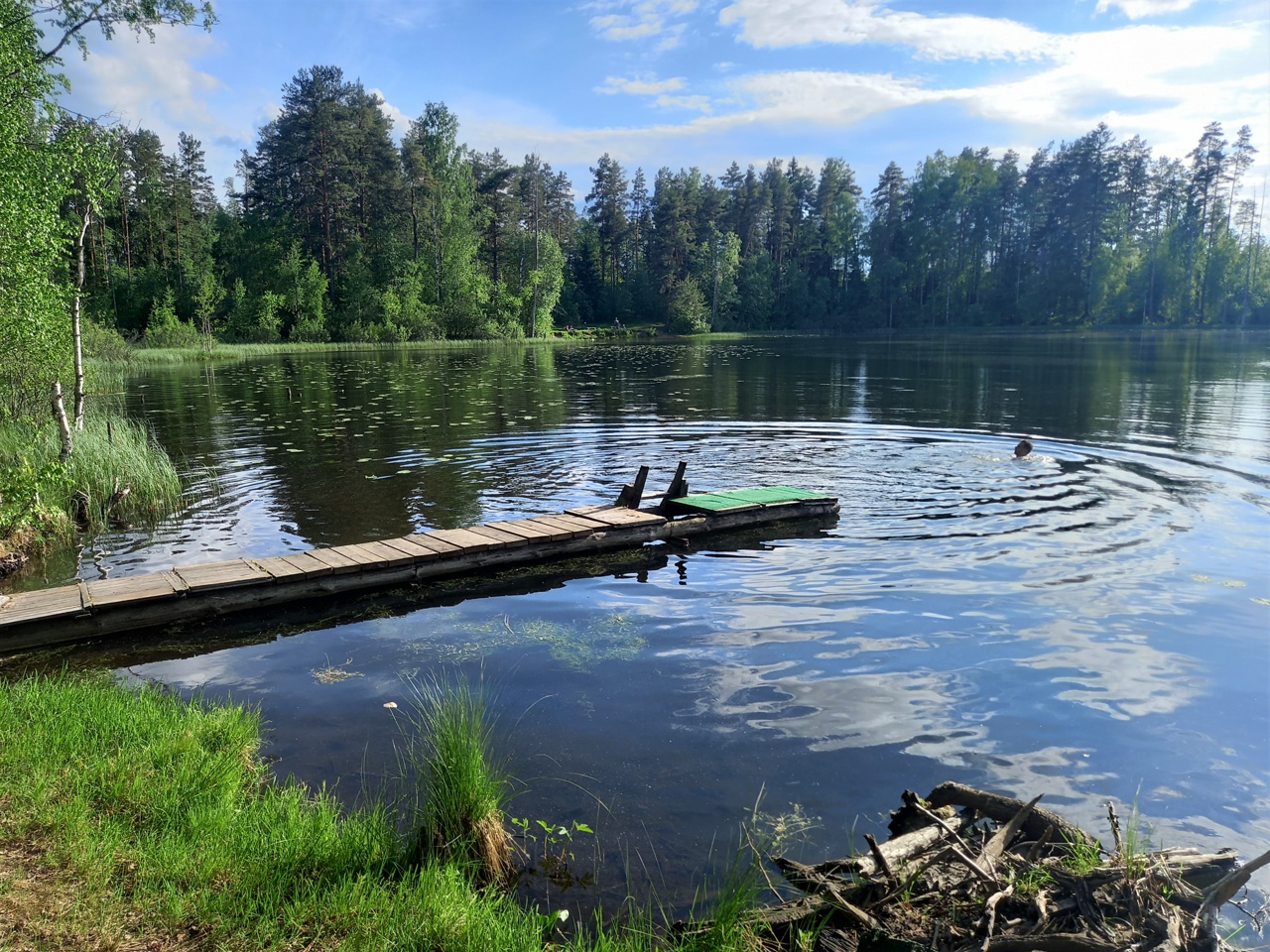 Озеро Нырково в шумный жаркий день выделяется в лучшую сторону. Берега здесь крутые и заросшие травой. Поэтому отдыхающих тут мало, и кто уж пришел сюда — ведет себя тихо. Машин на берегу нет. Это четвертое озеро у нас.