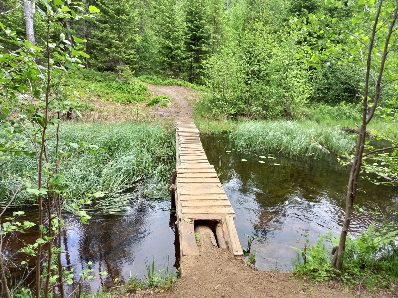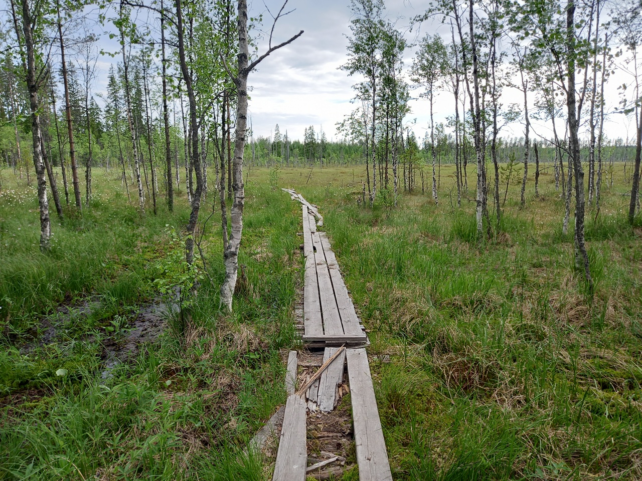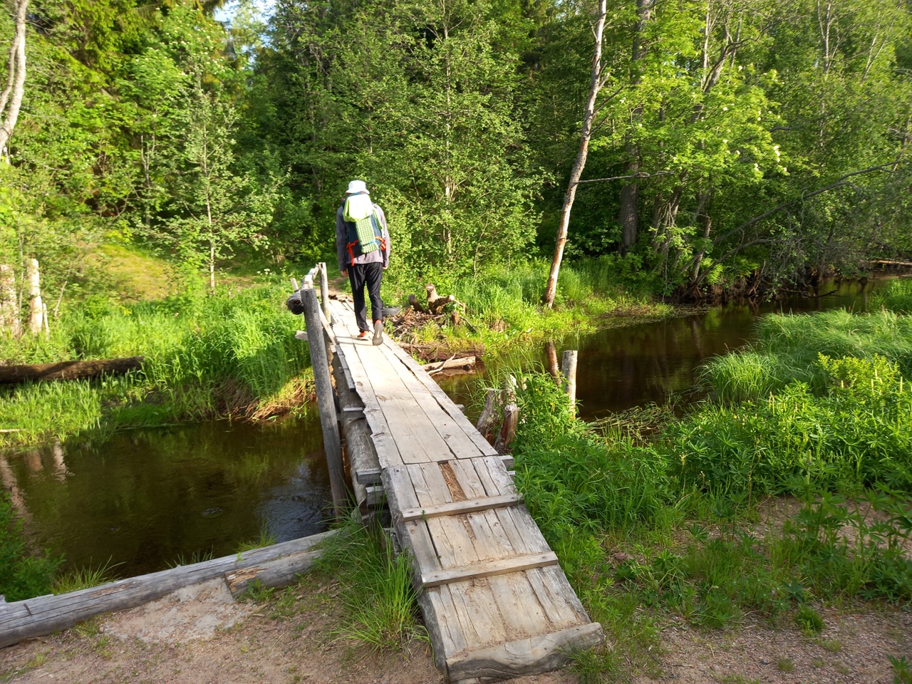 Дальше мы решаем идти через лес по тропке, которую увидели на карте. Тропка внезапно оказалась настилом через болото