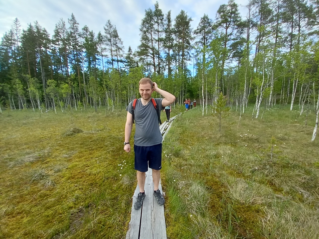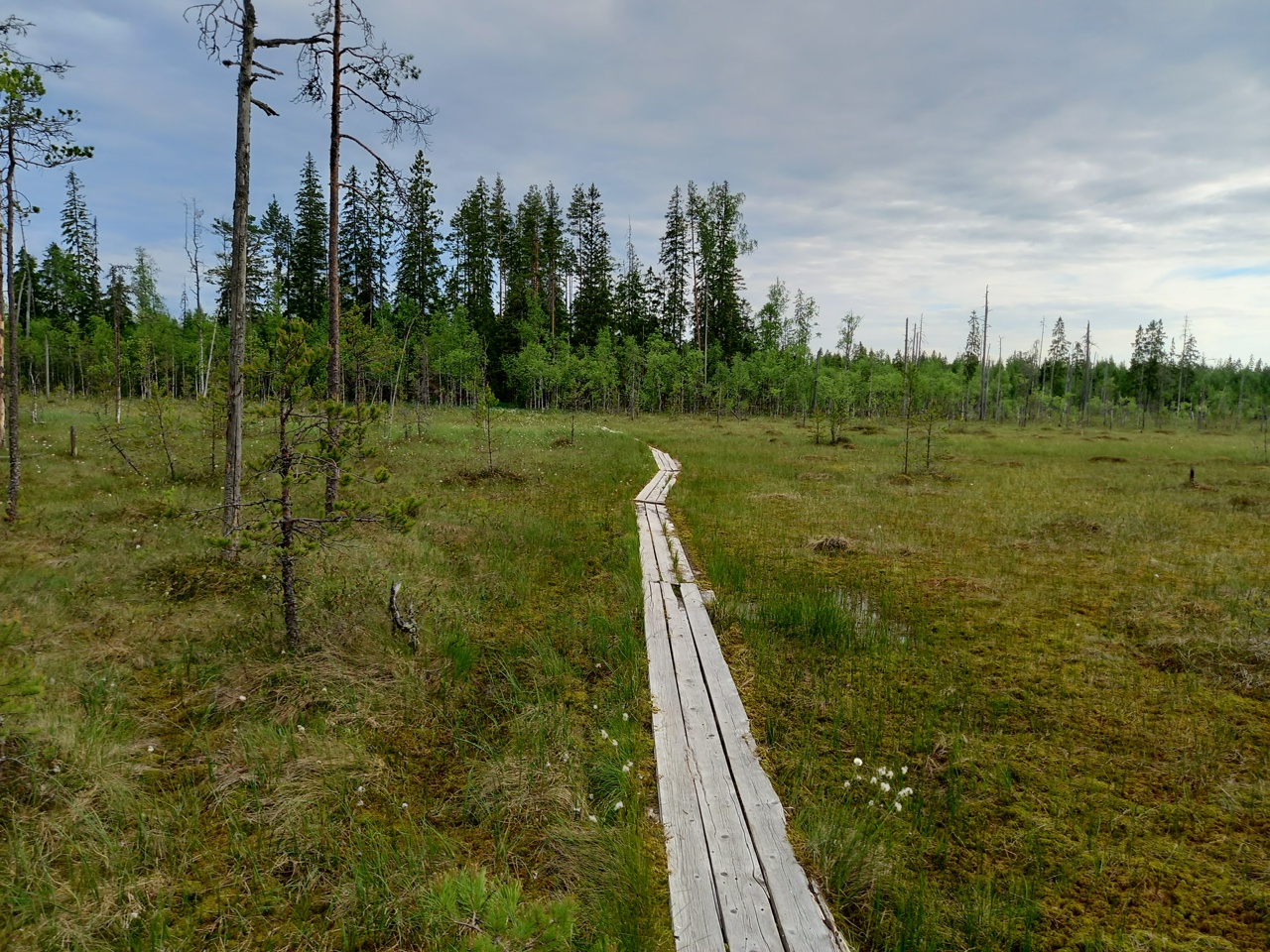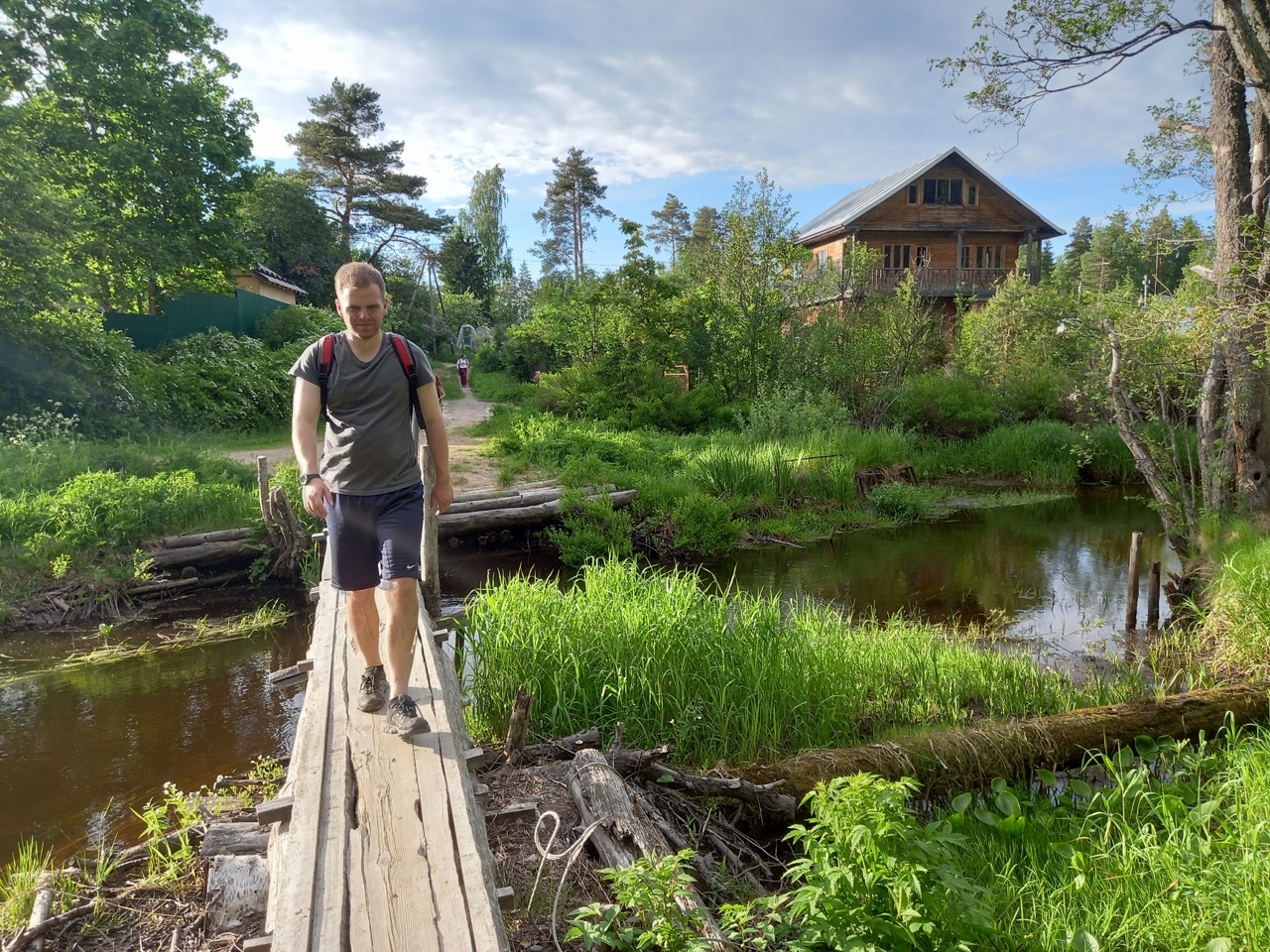 Дальше мы решаем идти через лес по тропке, которую увидели на карте. Тропка внезапно оказалась настилом через болото