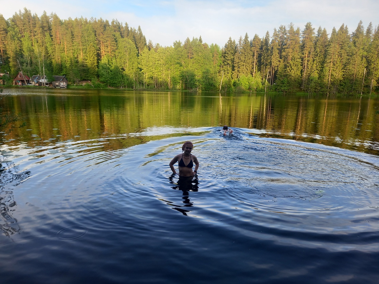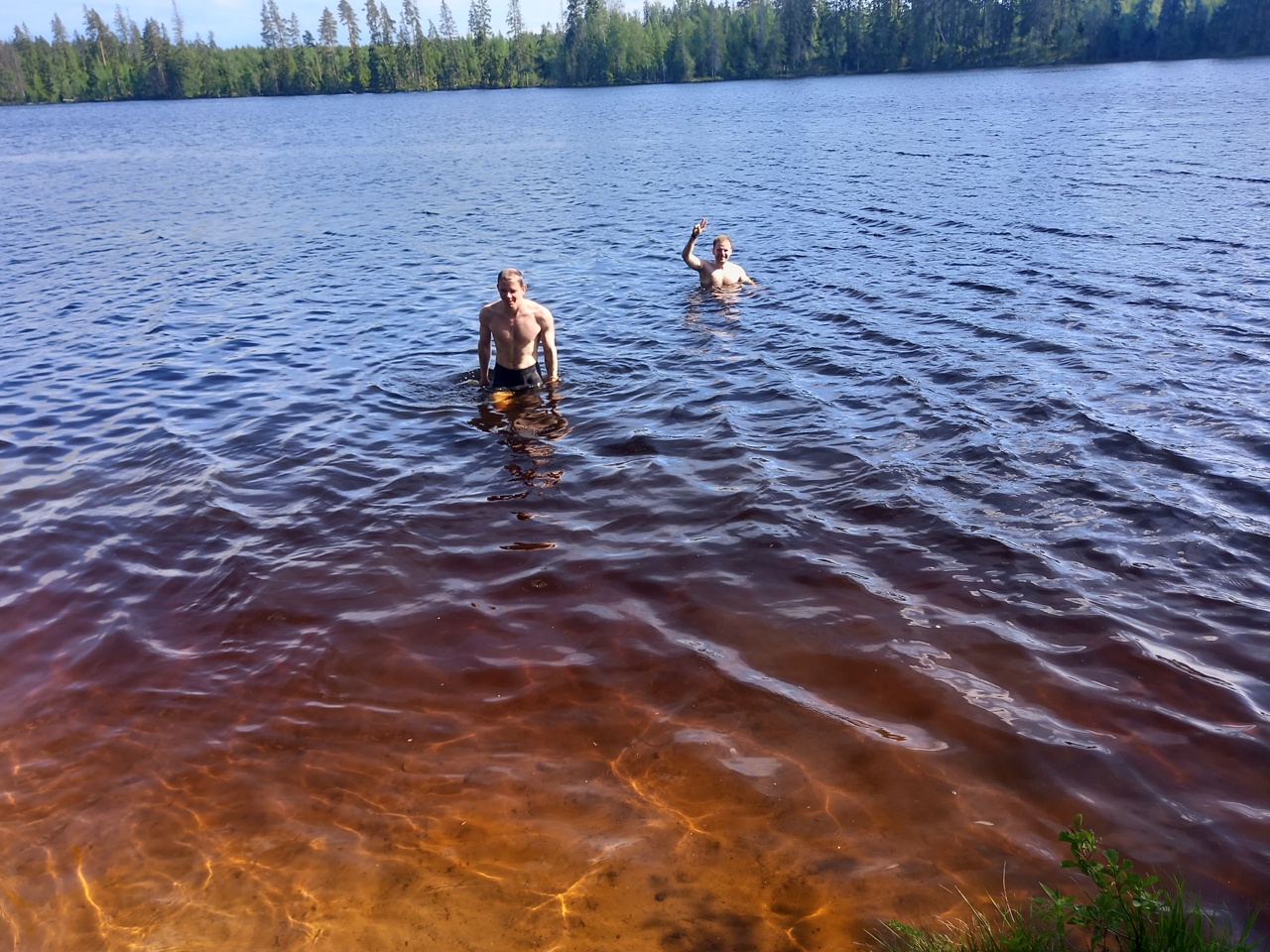 Купаемся. На фото видно прозрачную воду без торфяного оттенка. Красивое озеро!