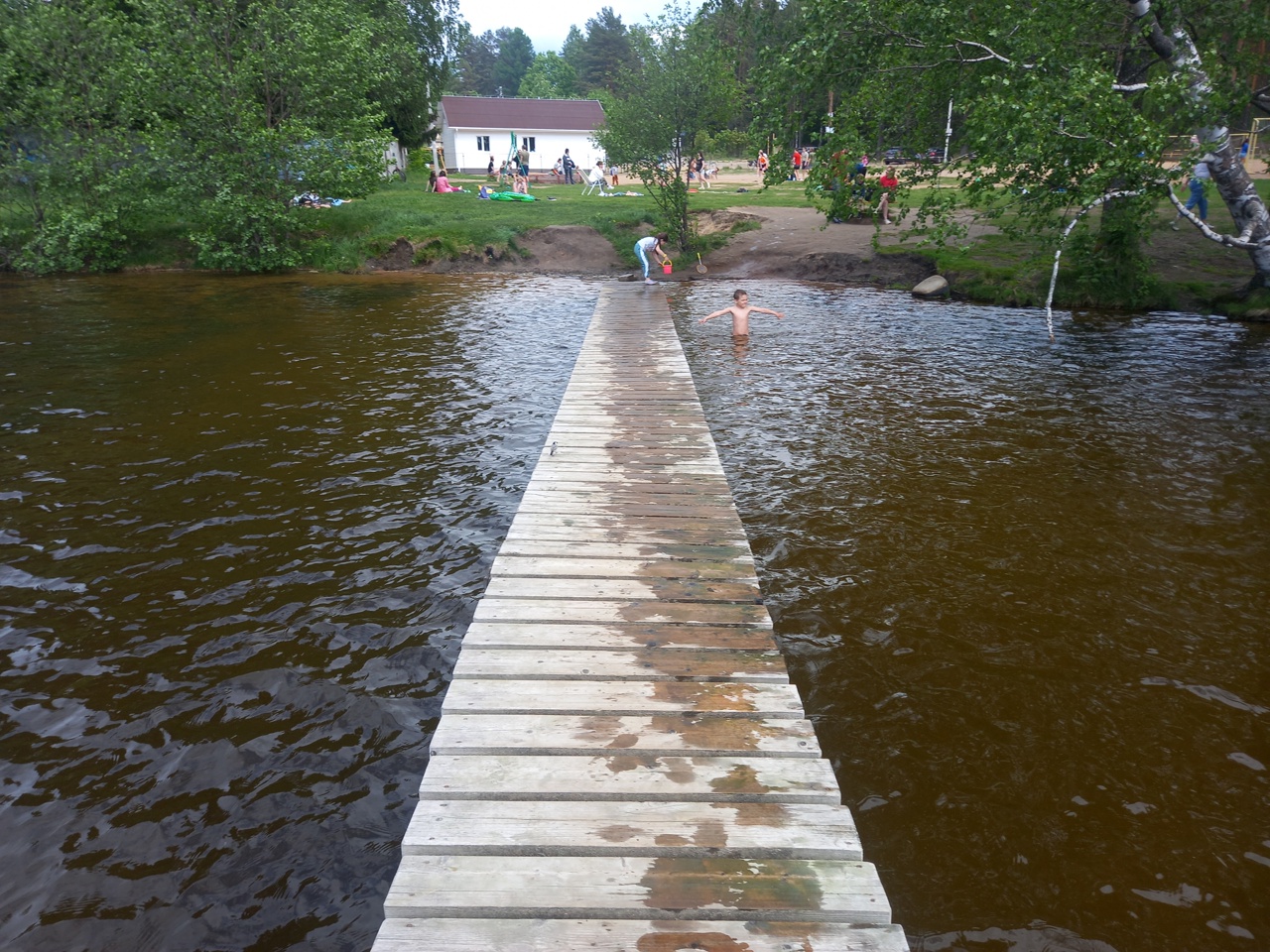 Вода торфяная, но не мутная. Купаться приятно.