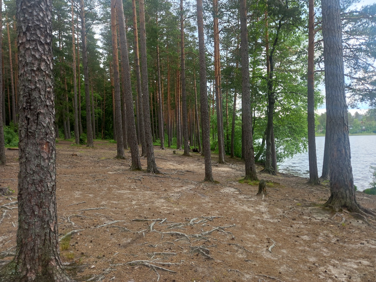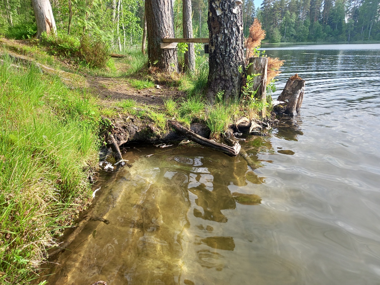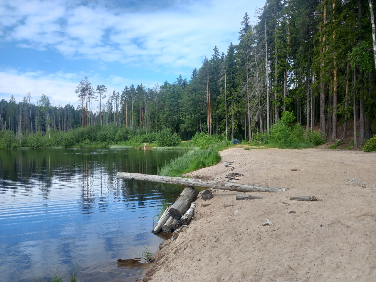 Подходим к пляжу. А вот тут все резко меняется. Возле пляжа растет сосновый лес. А подходы к воде удобные. И никакой заболоченности