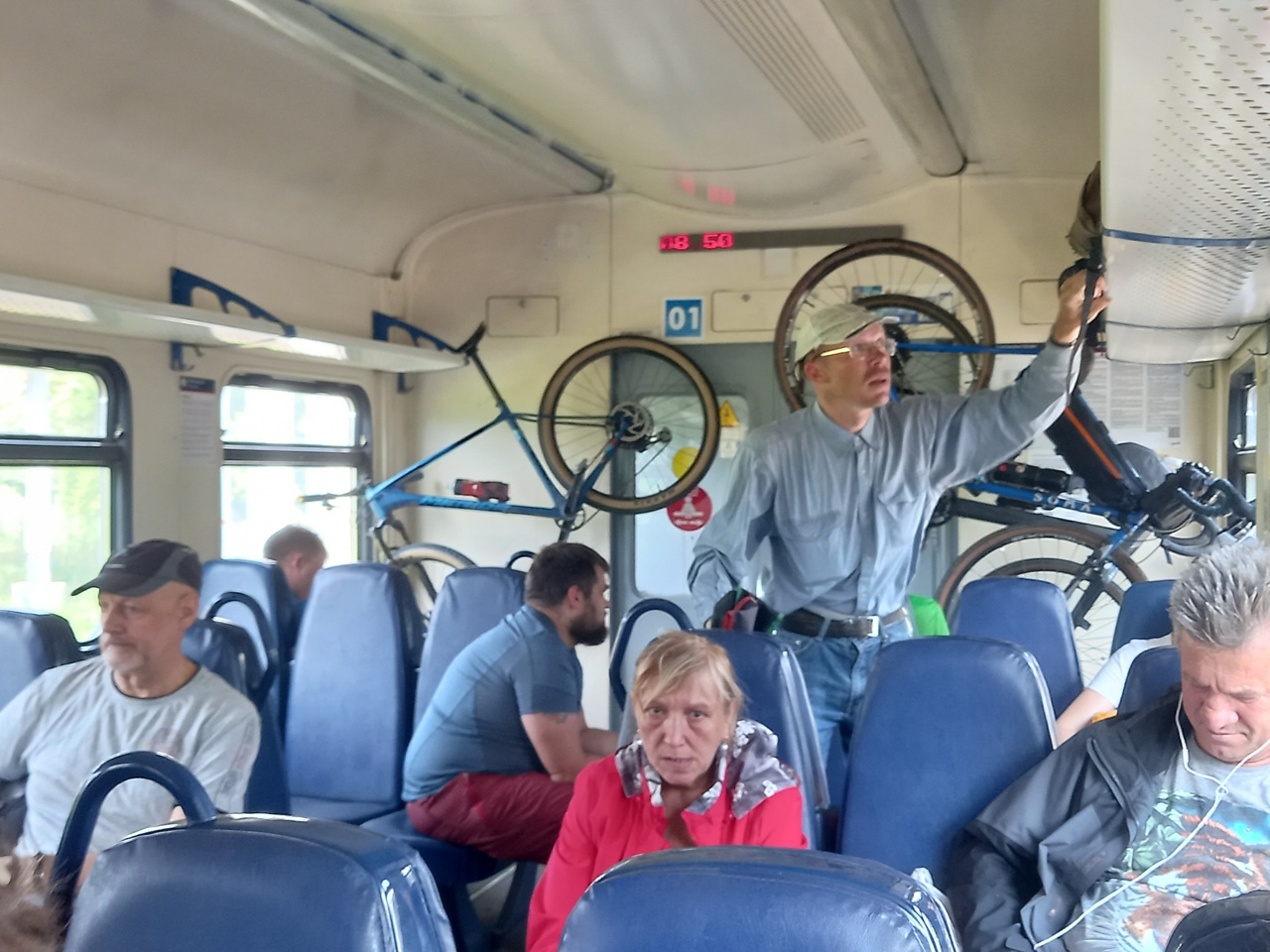 Впечатления от поездки у многих испортили велохамы, которые подвесили кучу велосипедов над головами людей, заставляя входивших в салон пассажиров нагибаться, чтоб не испачкаться о грязные колеса. Кроме того, при резком торможении поезда велосипед может слететь и убить впереди сидящих. Кроме тех, что на фото, я врезался, входя в салон, в велосипед и другого велосипедиста, и высказал ему, что думаю, он передо мной извинился. А вот эти, что на фото, когда я выложил этот кадр в своей группе в социальной сети, через неделю устроили настоящую визгливую истерику. Хотя лично их никто не оскорблял (я даже не знаю, кто хозяин велосипедов), они стали писать оскорбления в лично мой адрес, человек 10 написало мне истеричные хамские письма, про меня отдельную статью в своей велобыдлогруппе настрочили — вроде она там на букву Г как-то называется, что неудивительно (Г — оно и есть Г).