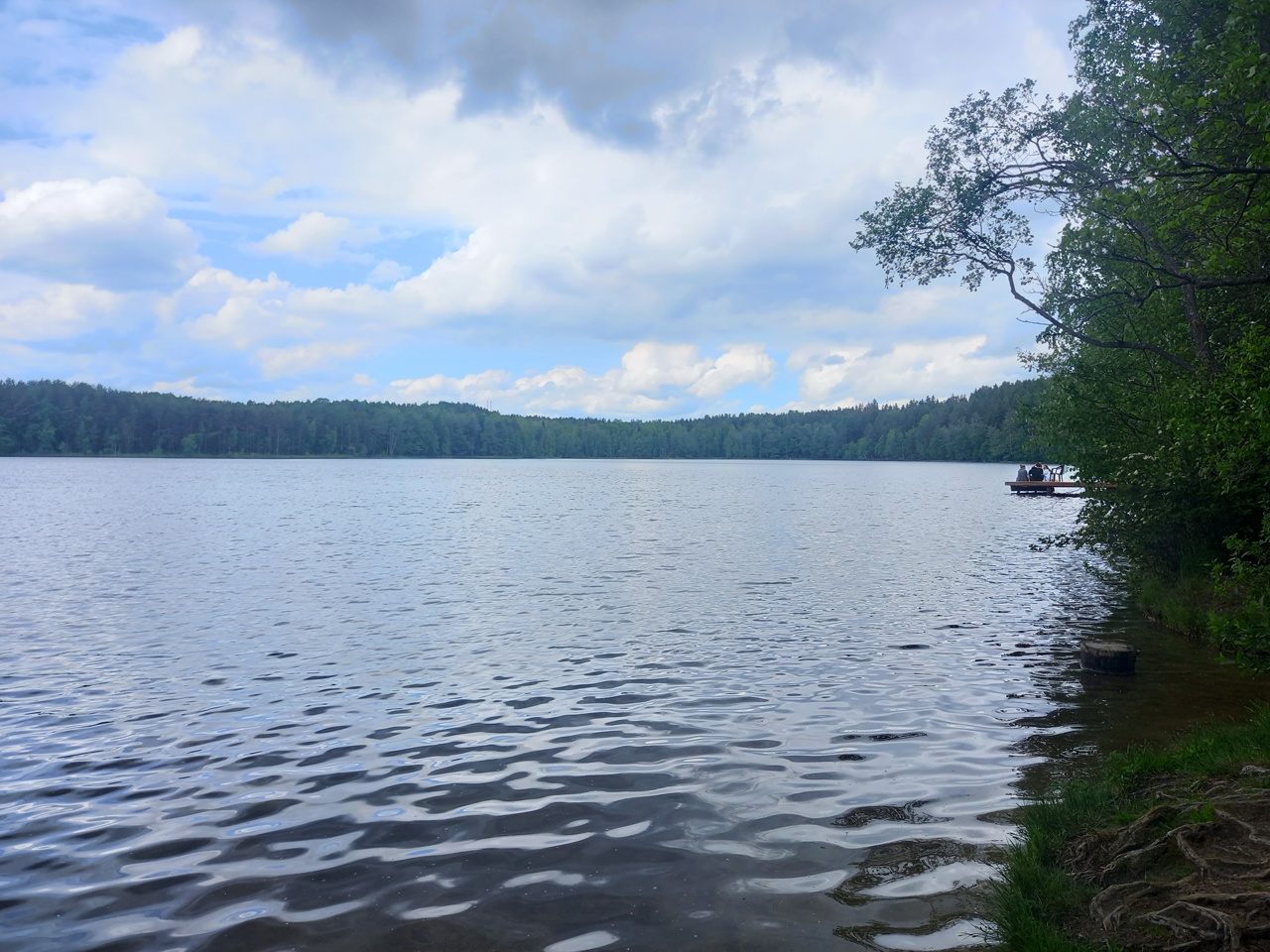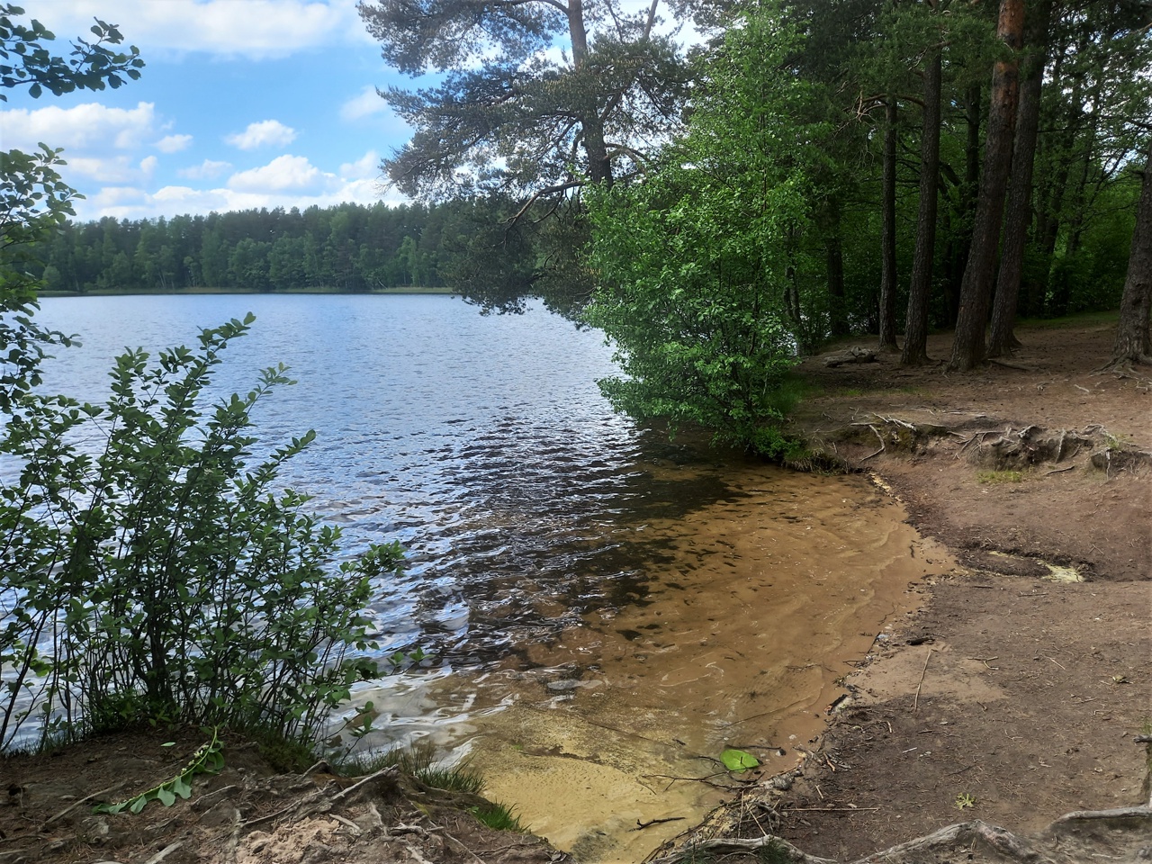 Единственный пляж на озере. Вода не мутная, но слегка торфяная. От этого пляжа совсем недалеко до шоссе, где можно припарковать машину, а потом пройти сто метров пешком.