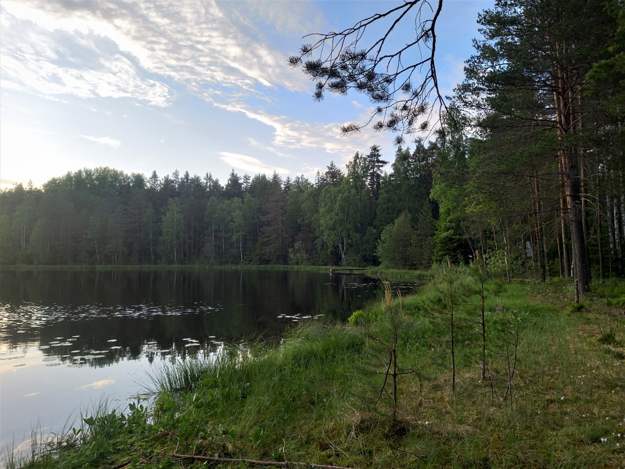 Идем купаться. Что удивительно — вода здесь уже не темная, а прозрачная. Не такая, как на озере Кельзалампи, но все равно с хорошей видимостью, без торфяного оттенка (или с очень легким). И дно не темное, а песчаное. Очень комфортно здесь! И лес рядом делает это озеро очень уютным. Намного лучше, чем Большое Борково. Вот такие приятные здесь заходы в воду!