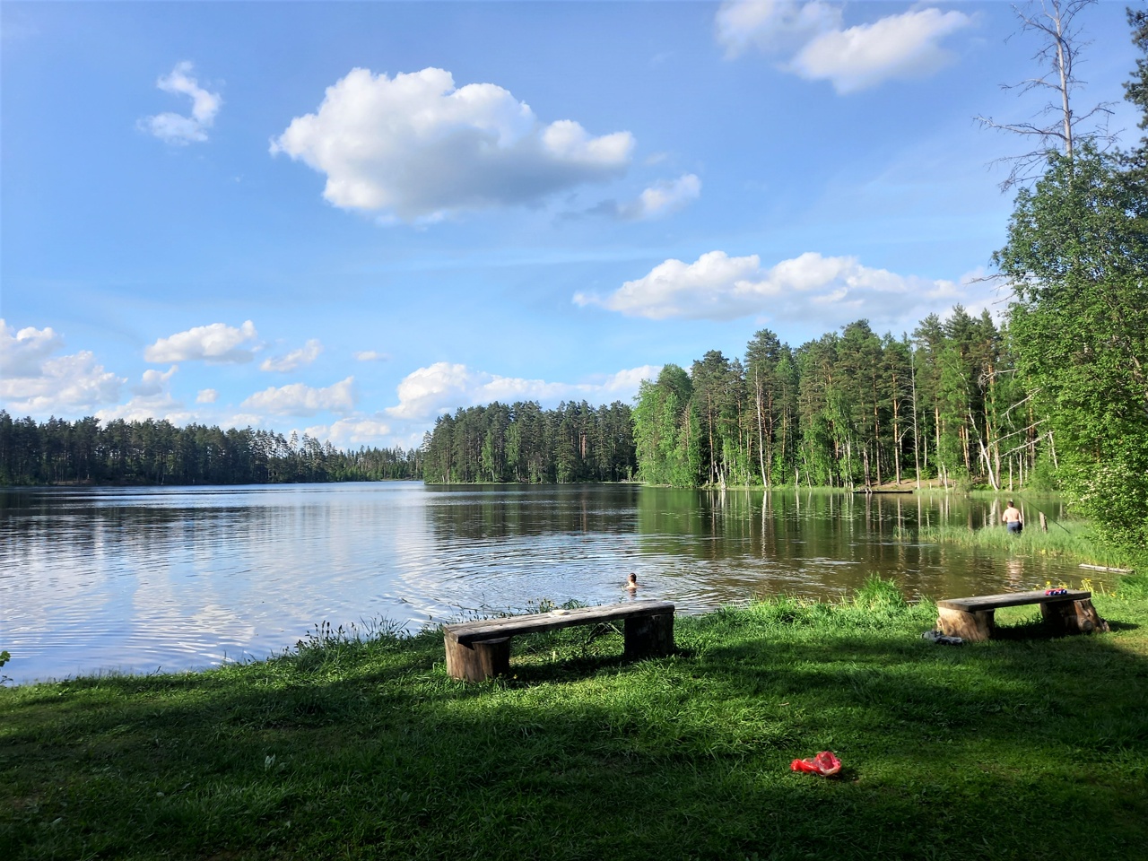 Отдыхающие тут тоже присутствуют, но их меньше. Это связано с тем, что половина берегов заболочены, и с палаткой там не встать. Поэтому шума на озере заметно меньше. А еще тут чистая прозрачная вода. Поэтому здесь делаем первый привал с купанием.